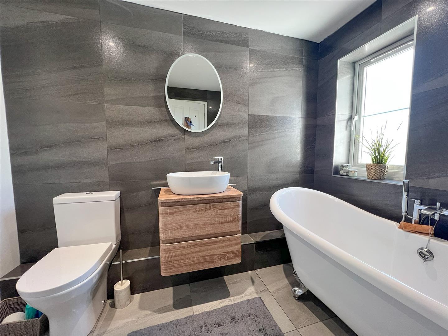 Family Bathroom - 2.59m x 1.98m (8'06 x 6'06) - Freestanding claw footed roll top bath with taps and shower attachment, vanity wash hand basin with monobloc mixer tap, cupboards beneath, close coupled w.c, single radiator, partially tiled walls, tiled flooring, inset ceiling spots, extractor fan, front aspect upvc obscure double glazed window.