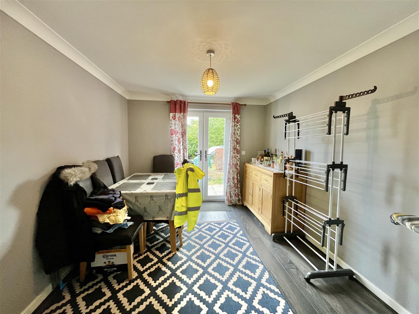 Dining Room - 3.99m x 2.90m (13'01 x 9'06) - Laminate wood effect flooring with underfloor heating, side aspect French doors lead out to the garden.
