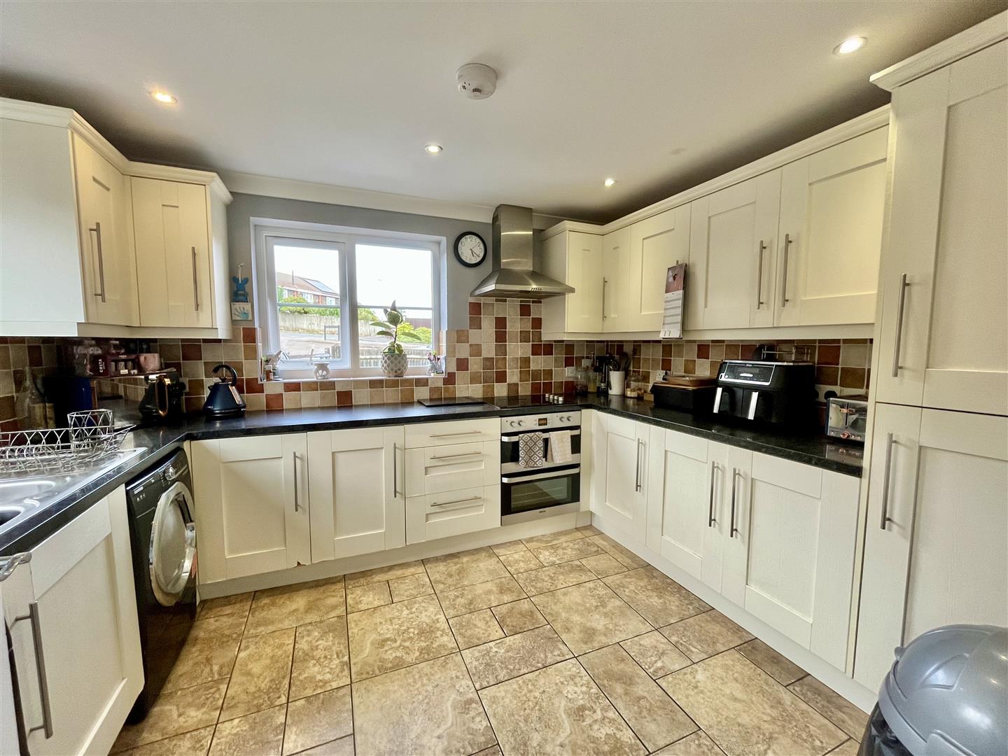 Kitchen - 3.45m x 2.84m (11'04 x 9'04) - Fully fitted wall and base level units with laminate worktops and tiled splash-backs, inset 1.5 bowl stainless steel sink unit with drainer, integral electric oven, induction hob and extractor hood, integral fridge/freezer, space and plumbing for a washing machine and tumble dryer or dishwasher, tiled floor with underfloor heating, front and side aspect windows.