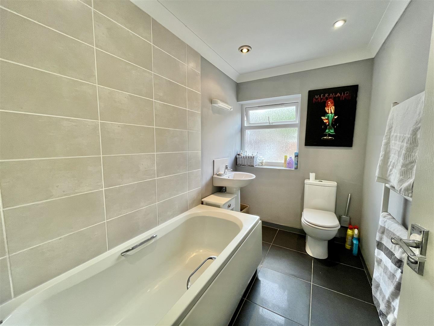 Family Bathroom - 2.67m x 1.60m (8'09 x 5'03) - Comprises a bath with electric shower over, low level w.c, pedestal washbasin with tiled splashbacks, heated towel rail, tiled floor, obscured side aspect window.