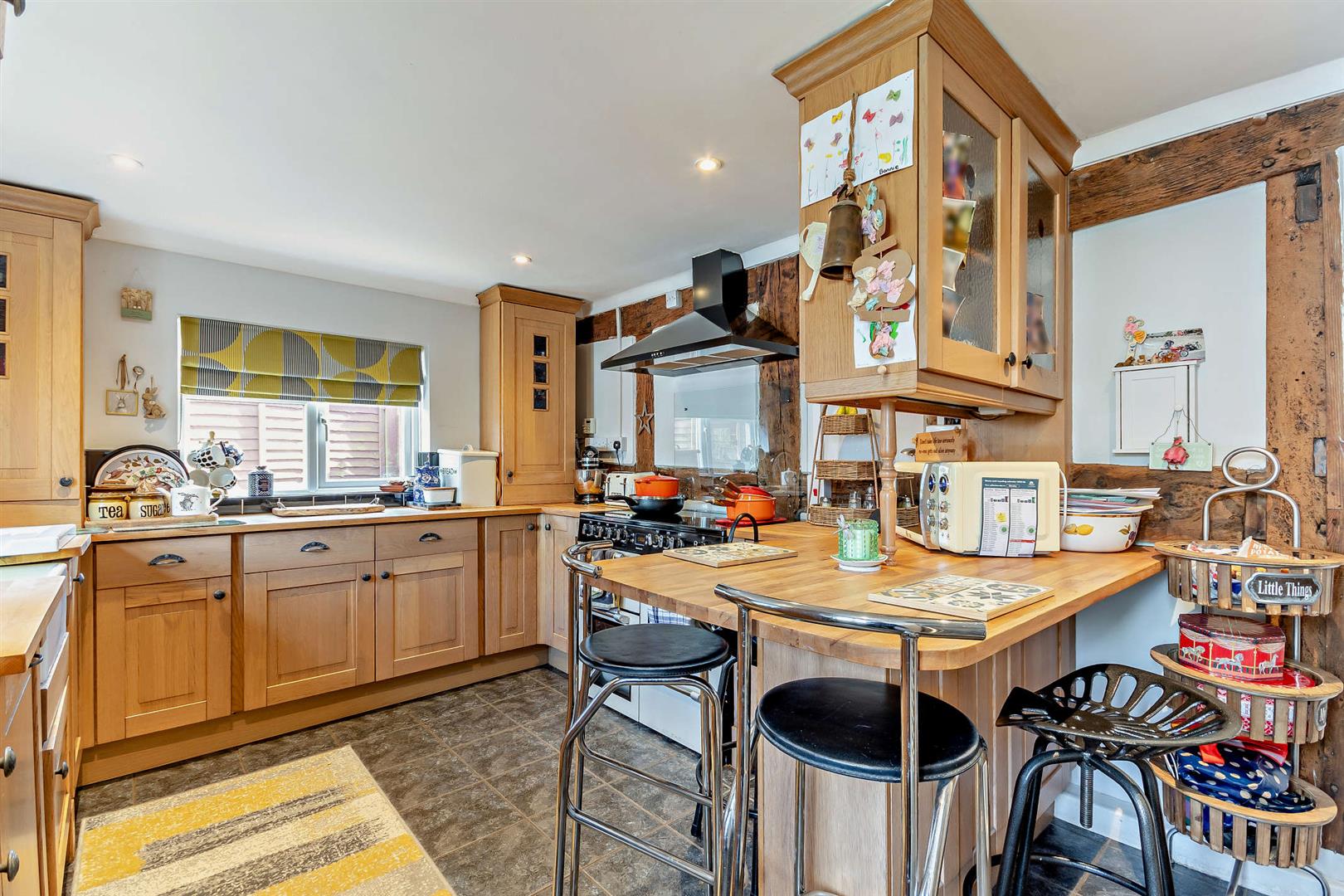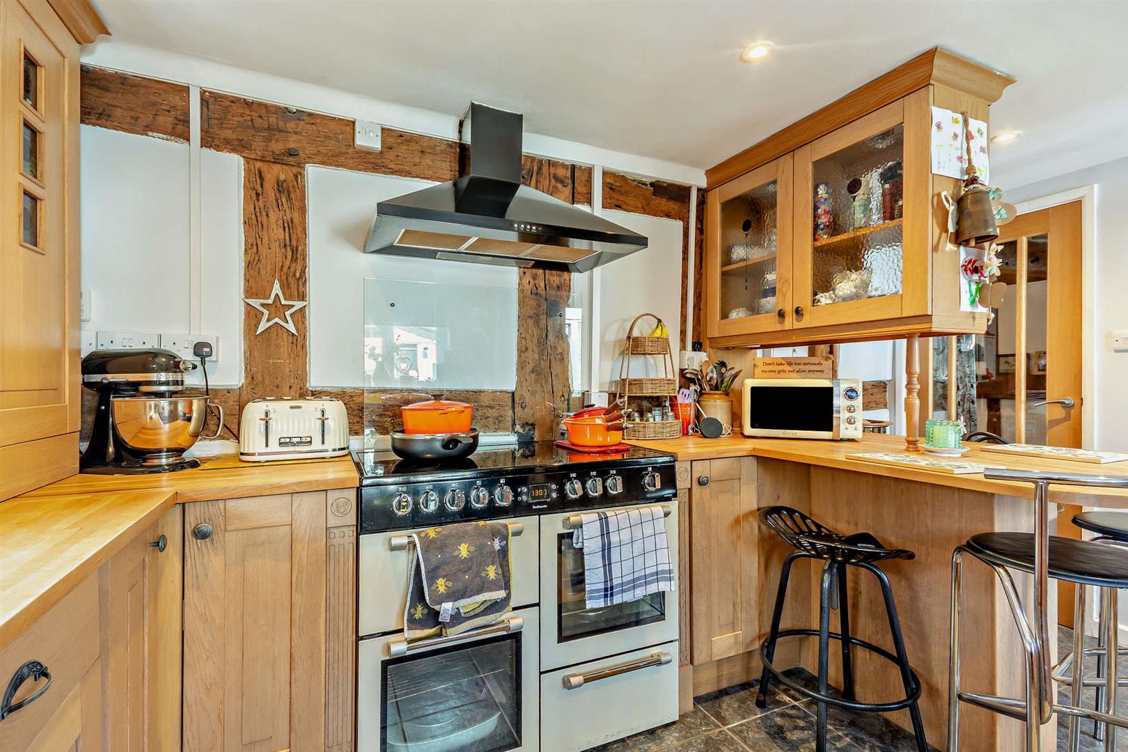 Kitchen / Breakfast Room - Fitted kitchen to comprise single drainer sink unit mixer tap with cupboard under, range of base and wall mounted units, fitted cooking range, hot plates, warming plate, ovens and grill, built-in cooker hood above, integrated dishwasher, fridge / freezer, breakfast bar, tiled flooring, exposed timbers, heated towel rail, side and rear aspect window overlooking the garden, half glazed door to: