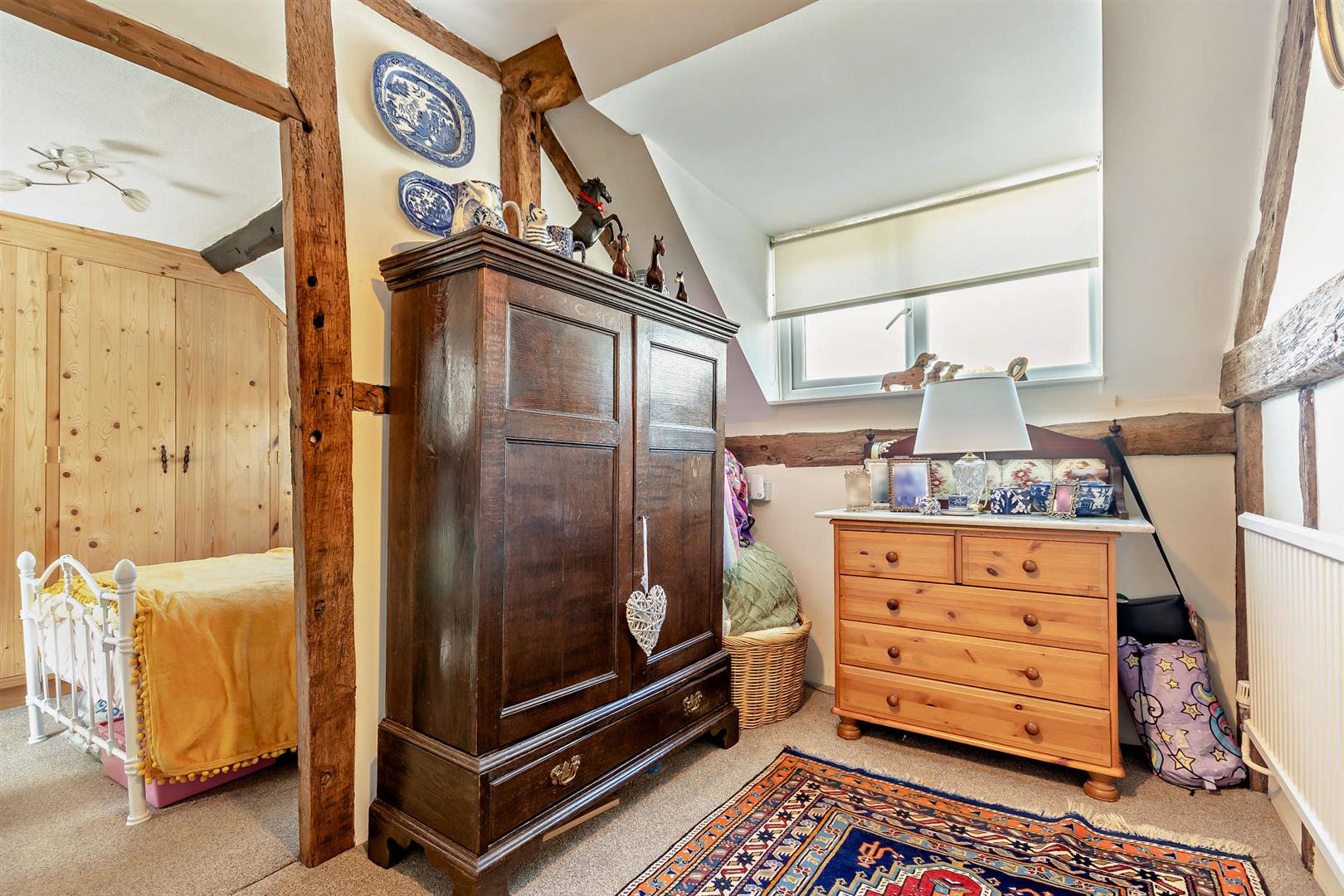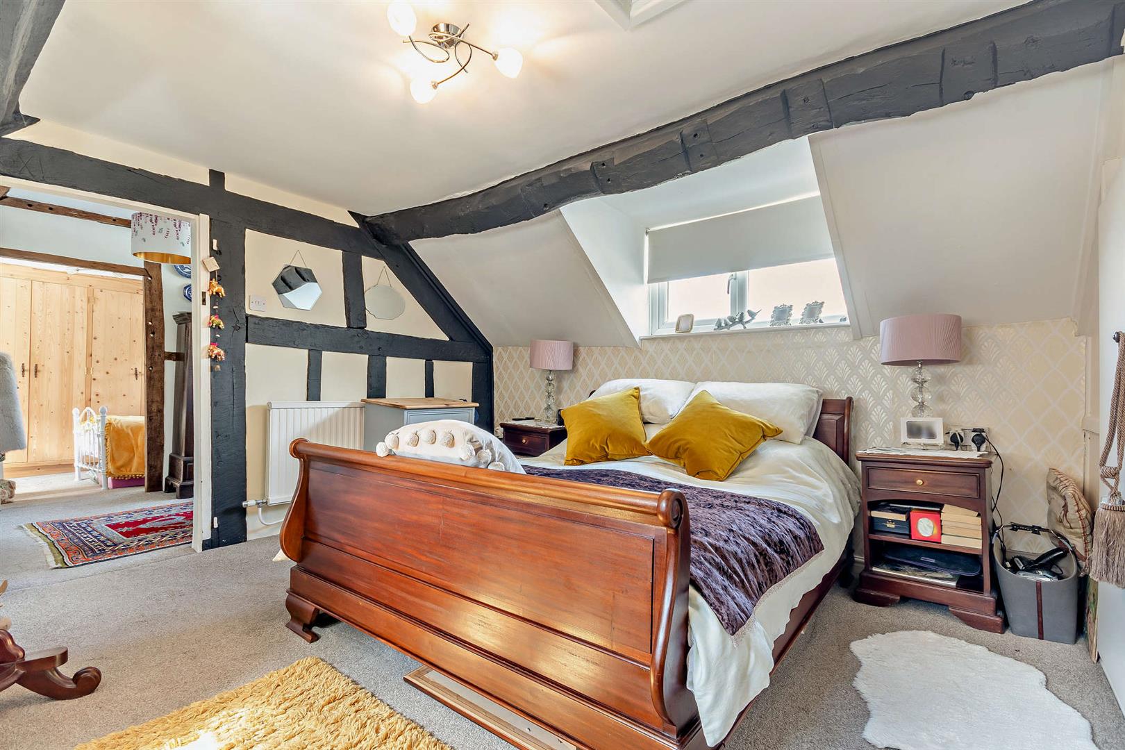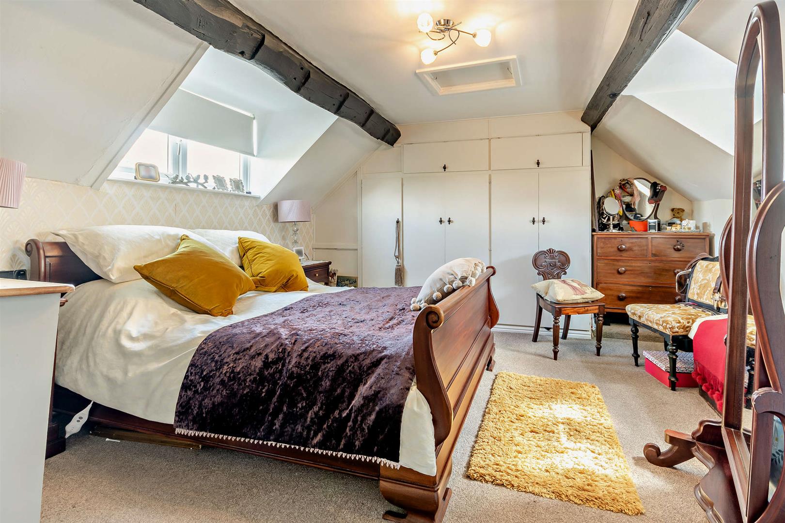 Master Bedroom - 4.17m x 3.94m (13'8 x 12'11) - Double radiator, two fitted wardrobes with hanging rail and shelving, cupboards above, exposed beams, access to roof space, front and rear aspect windows.