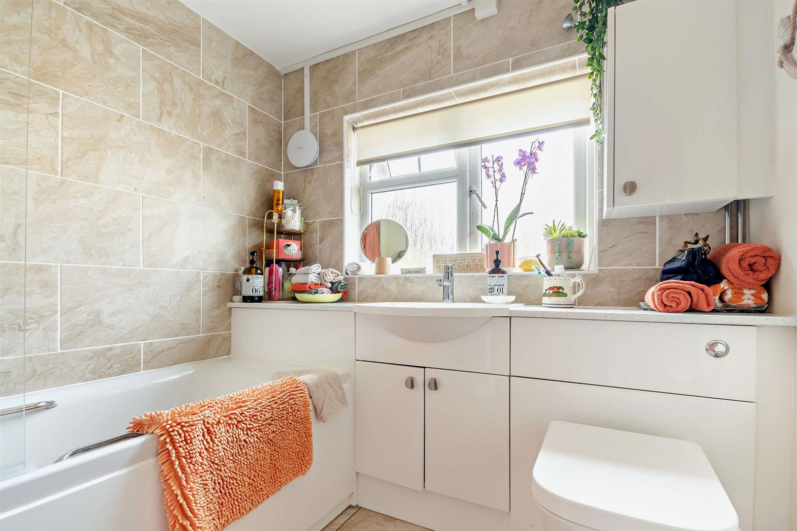 Bathroom - White suite comprising modern panelled bath, shower attachment over, tiled surround, vanity wash hand basin with cupboards below, close coupled WC, heated towel rail, tiled flooring, rear aspect frosted window.