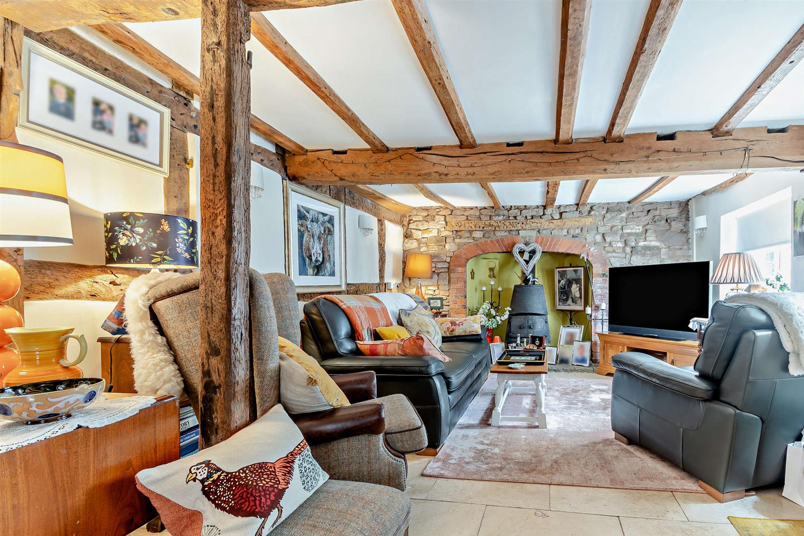 Sitting Room - 4.24m x 3.84m (13'11 x 12'7) - Fireplace with raised hearth, arched brick surround, feature wood burning stove (currently not in use), tiled flooring, double radiator, exposed wall and ceiling timbers, front aspect window, opening to: