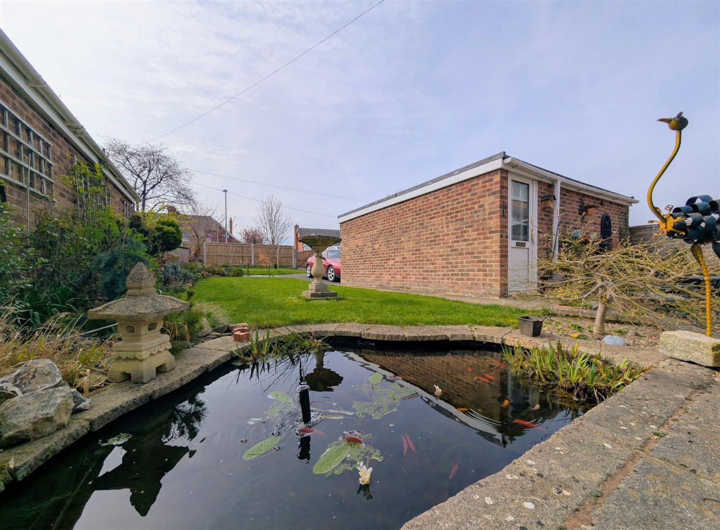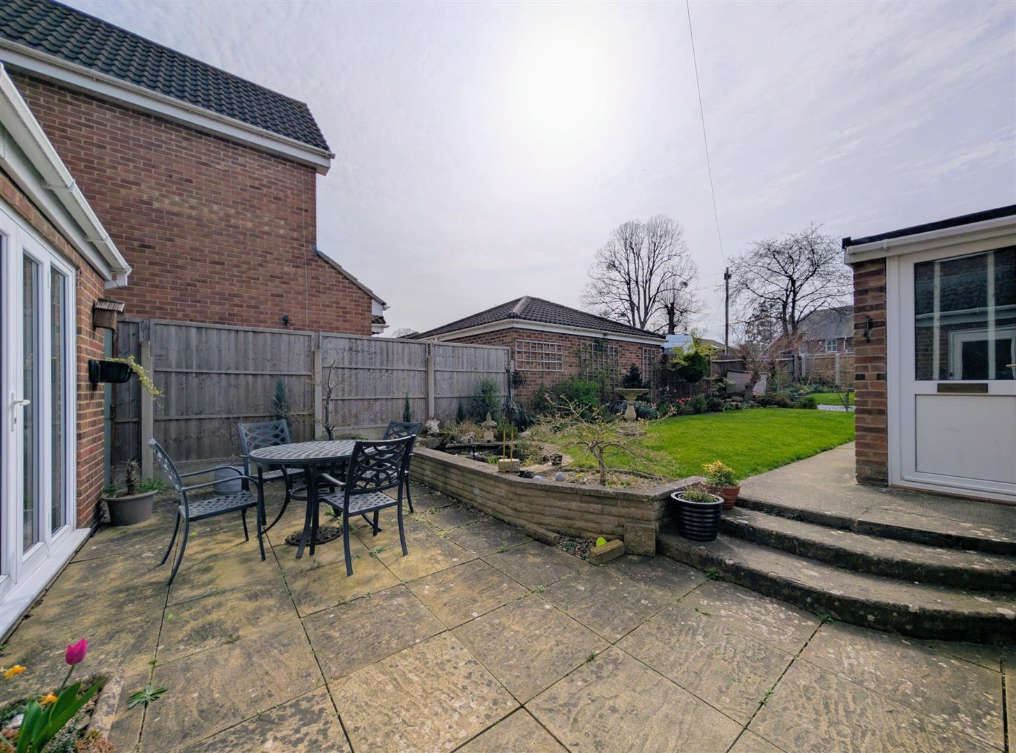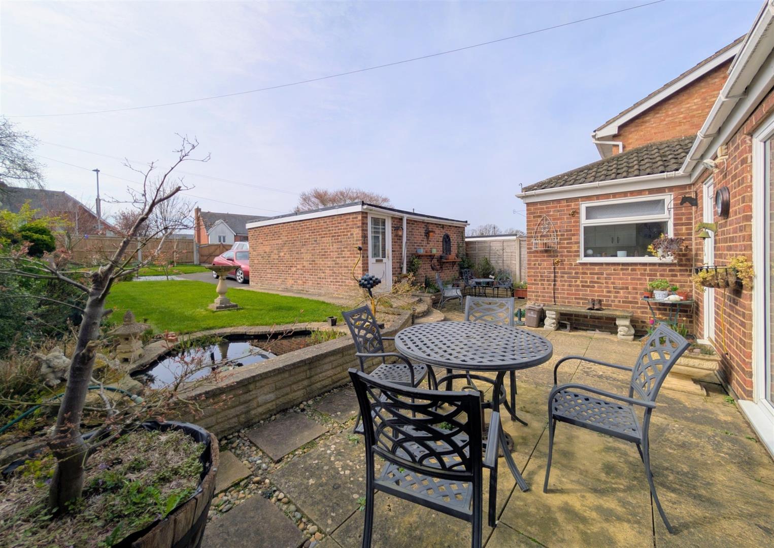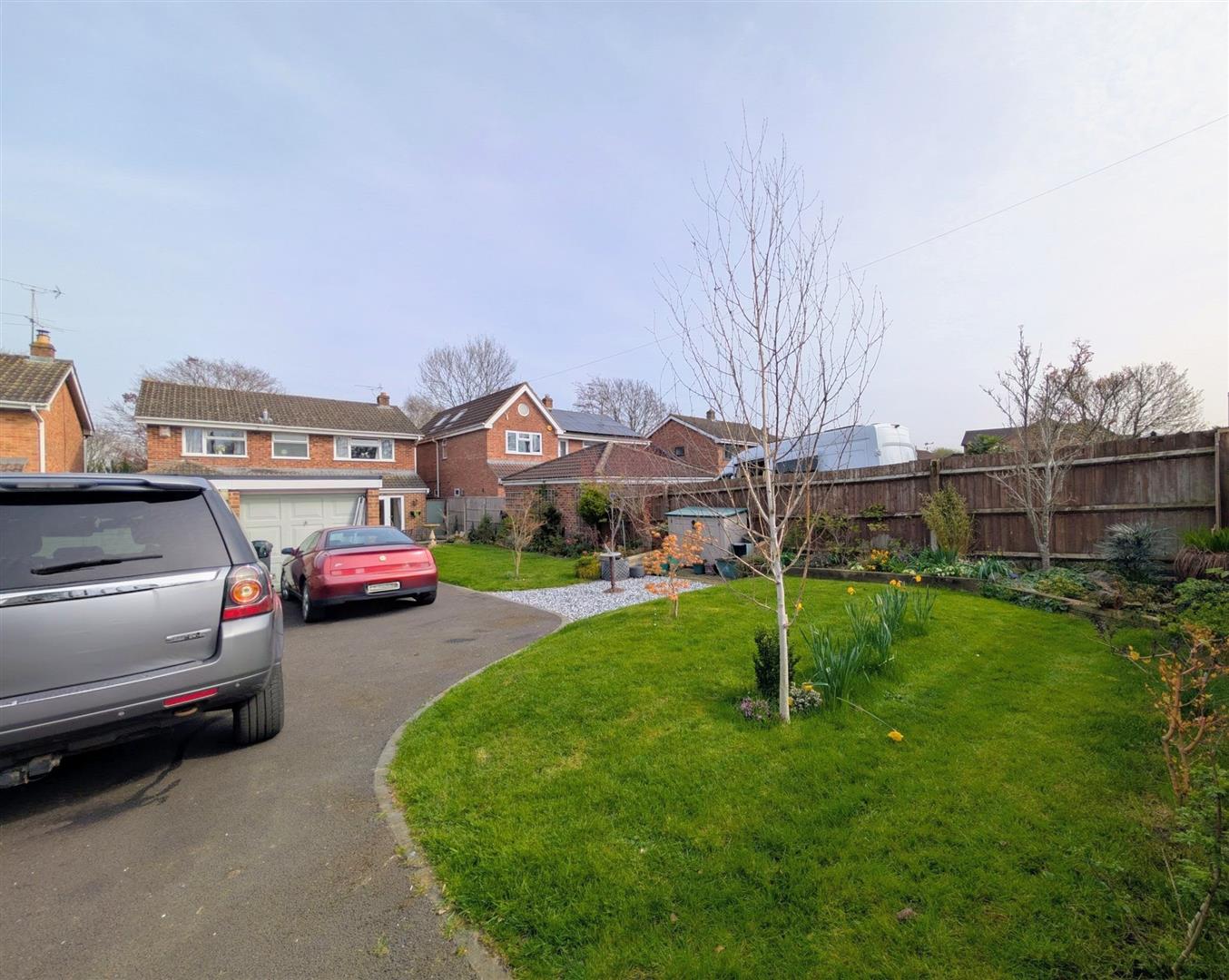 Outside - The front garden is laid to lawn with a hedgerow and a pathway leading to the front door and around the property.
