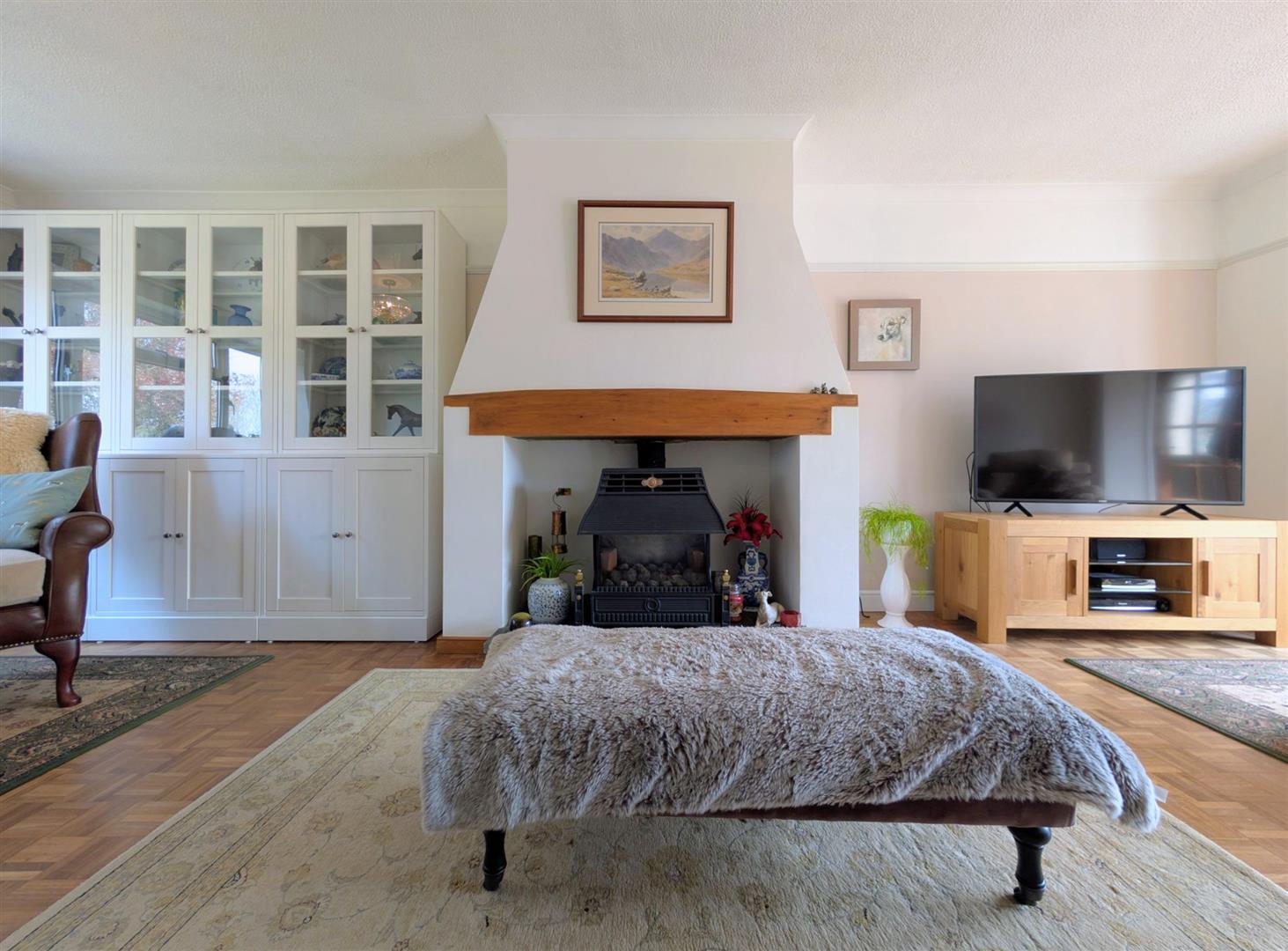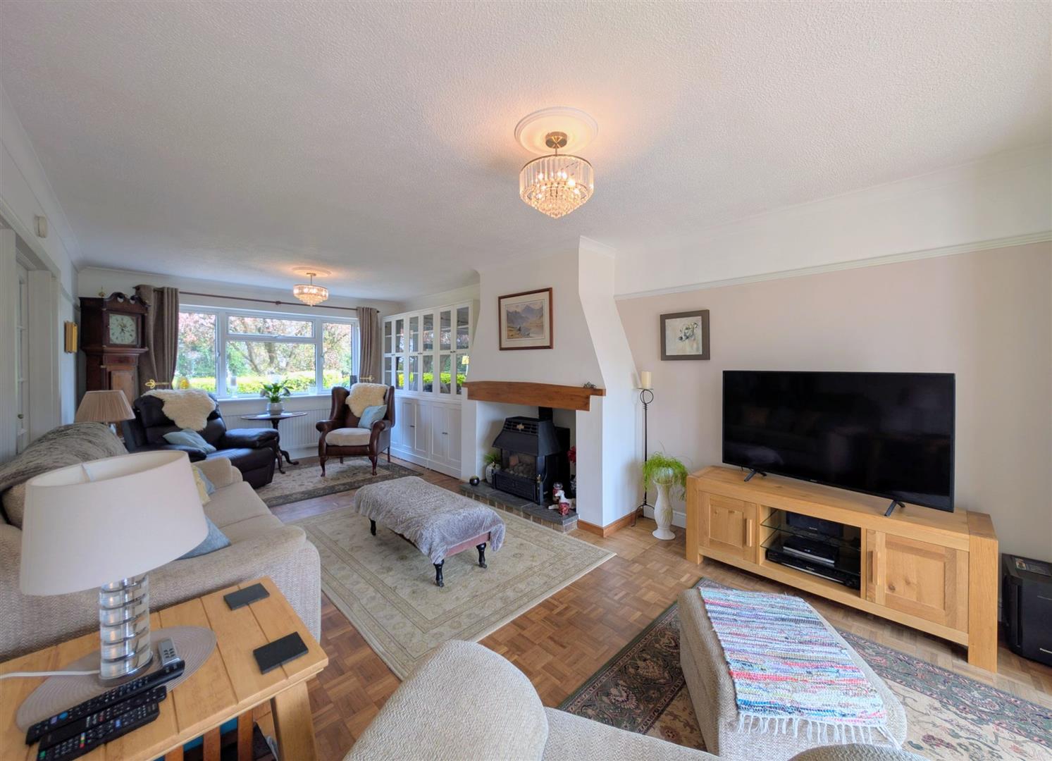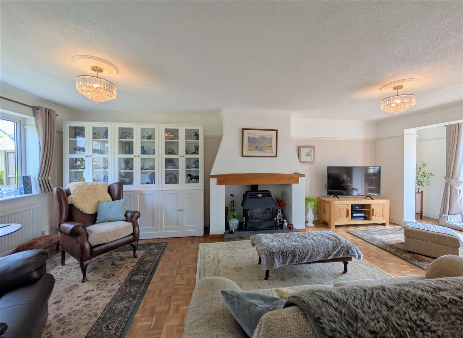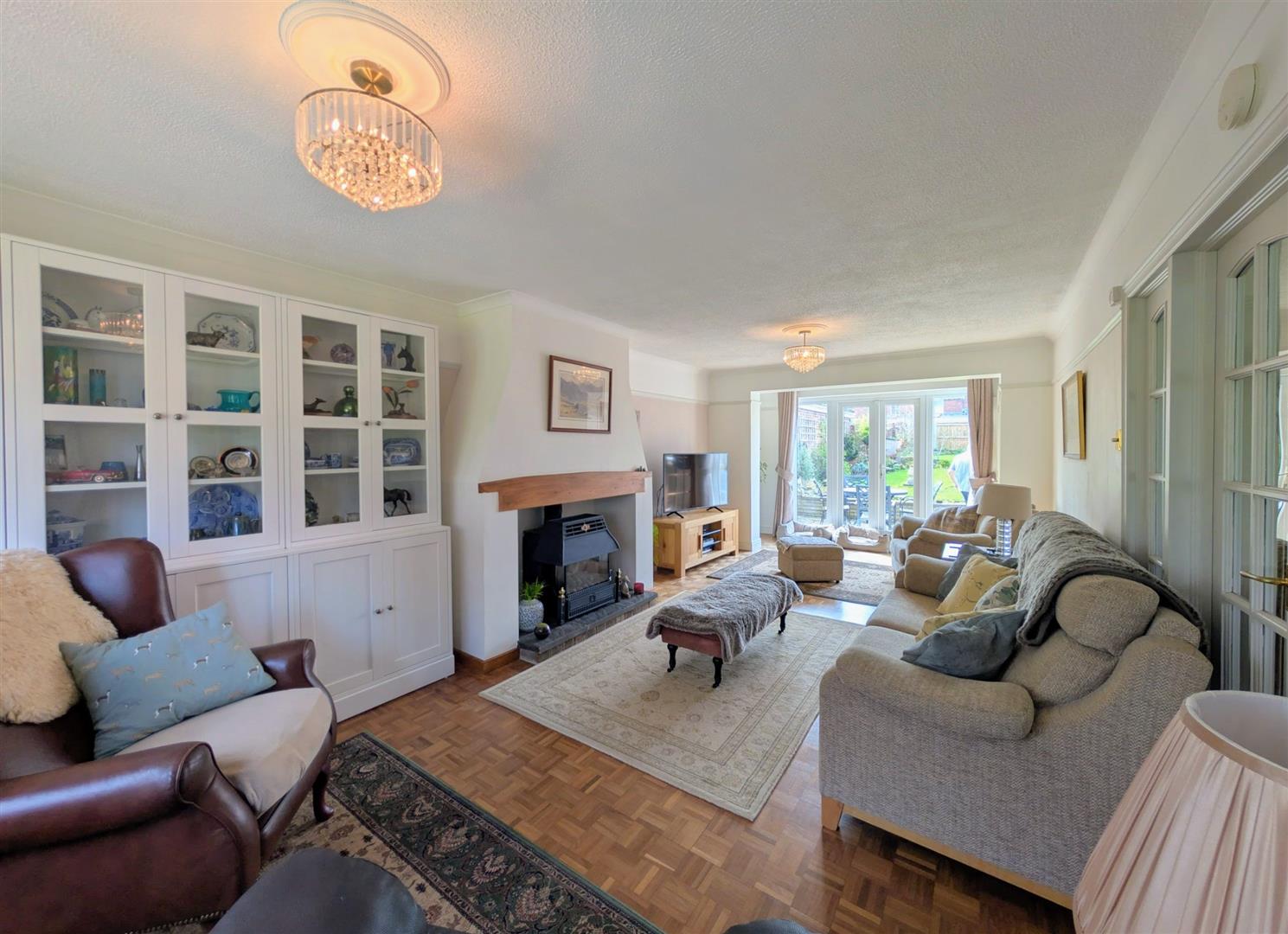 Lounge - 8.33m x 3.56m max (27'4 x 11'8 max) - Original parquet flooring, fireplace housing the log effect gas fire with a paved hearth and hardwood lintel, picture rail, double and single radiators, upvc double glazed door to front elevation, matching French doors to rear elevation overlooking the rear garden.