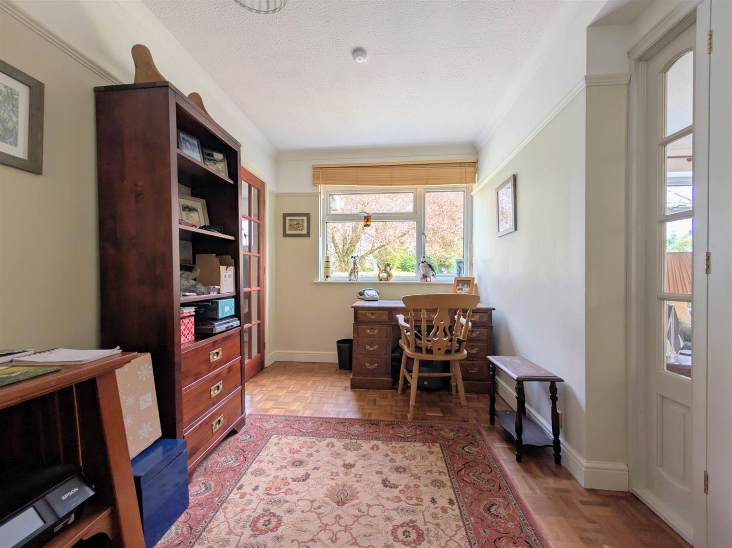 Study - 3.73m x 2.24m (12'3 x 7'4) - Parquet flooring, single radiator, picture rail, upvc double glazed window to front elevation, double doors lead into: