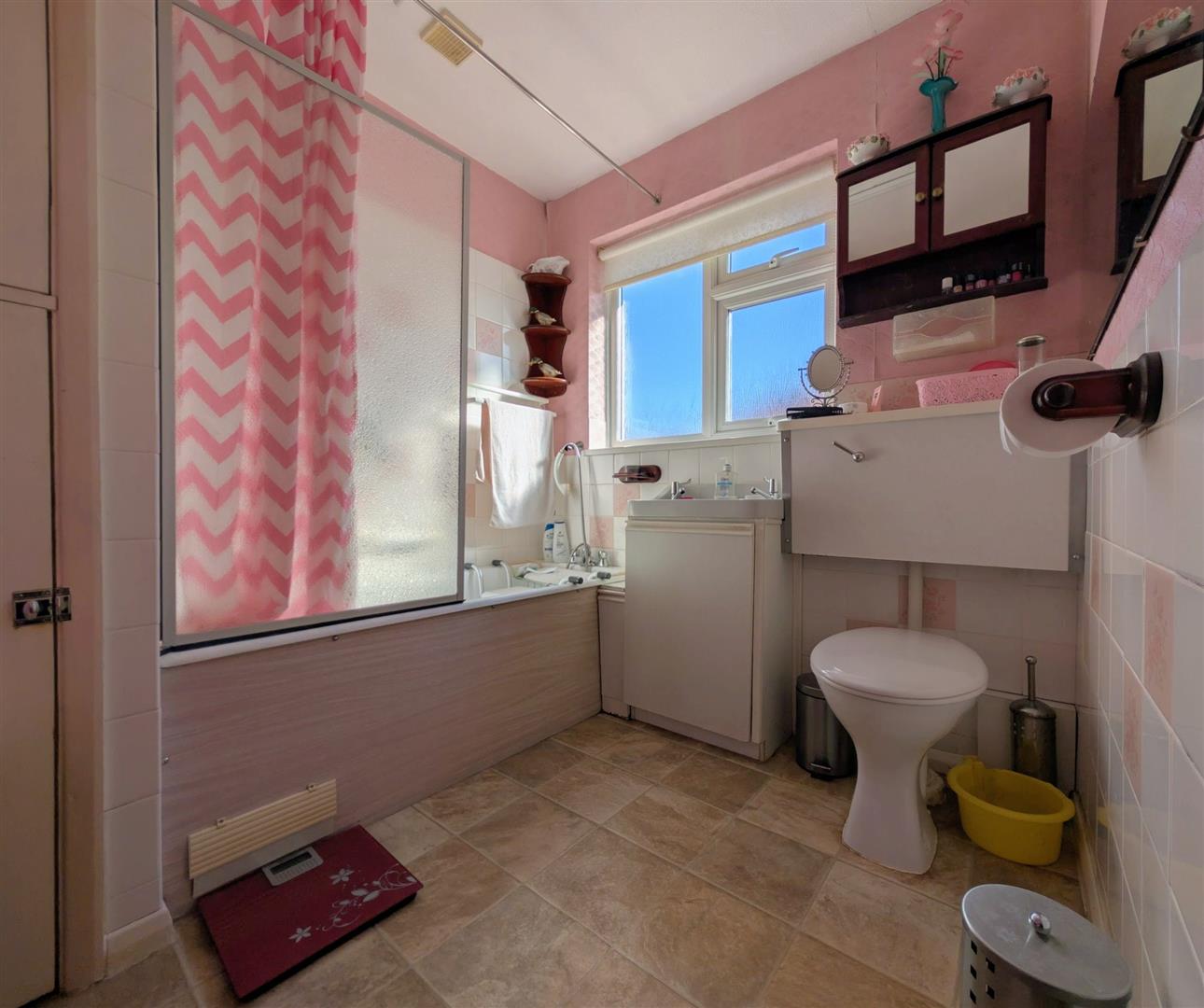 Bathroom - White suite comprising wash hand basin with vanity unit below, low level w.c., panelled bath with an electric shower over, tiled splashback, radiator, upvc double glazed opaque window to side aspect.