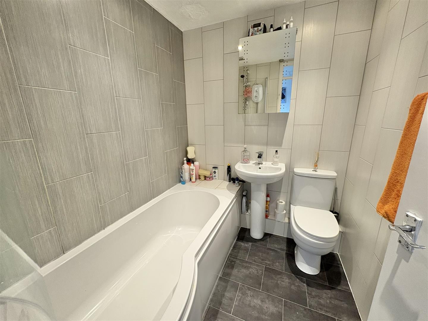 Bathroom - White suite comprising "p" shaped bath with an electric Mira shower over, pedestal wash hand basin, close coupled w.c., fully tiled walls, wall mounted mirror fronted medicine cabinet, extractor fan, chrome heated towel rail.