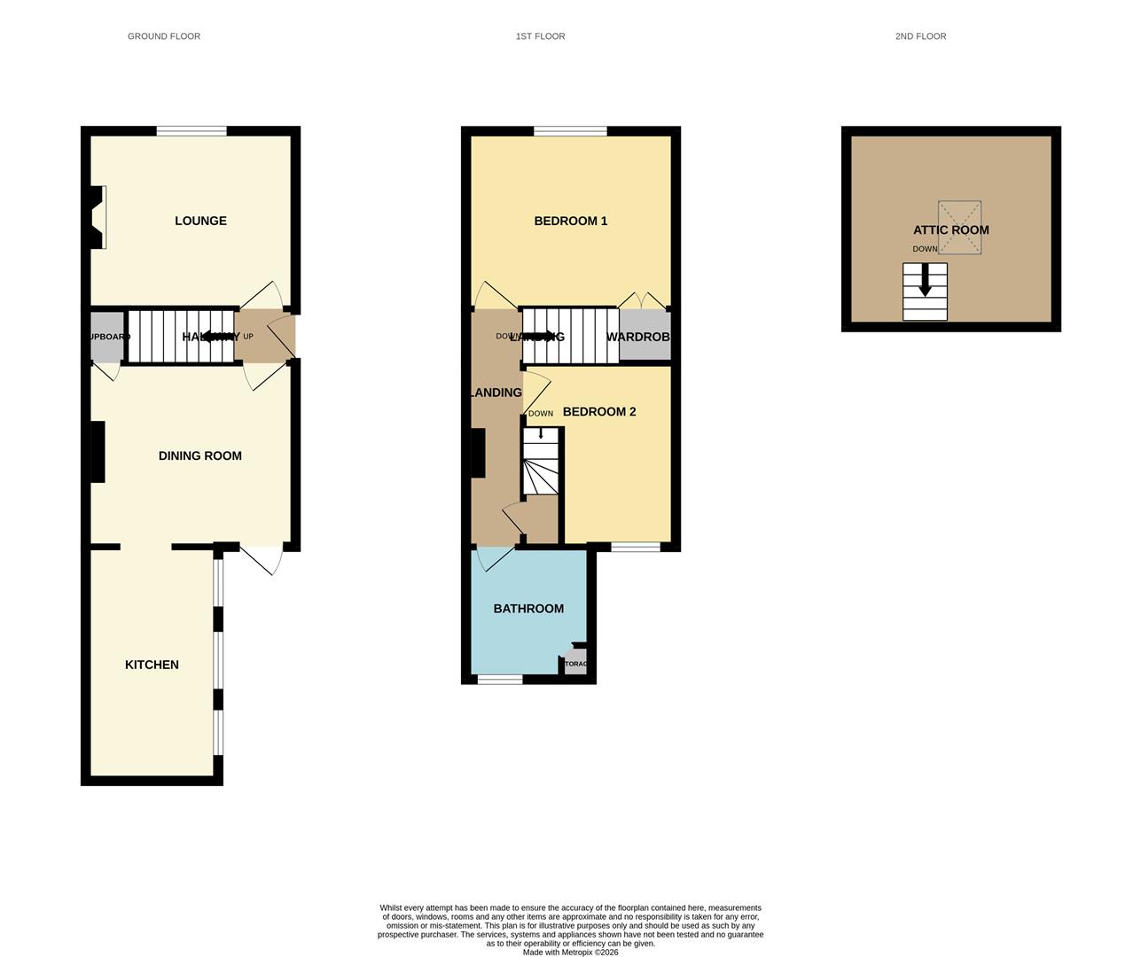 Accommodation comprises entrance hallway, lounge with an open fireplace, dining room with a door onto the garden, 13ft fitted kitchen, bedroom one with a fitted wardrobe, bedroom two, bathroom with a white suite and the attic room.