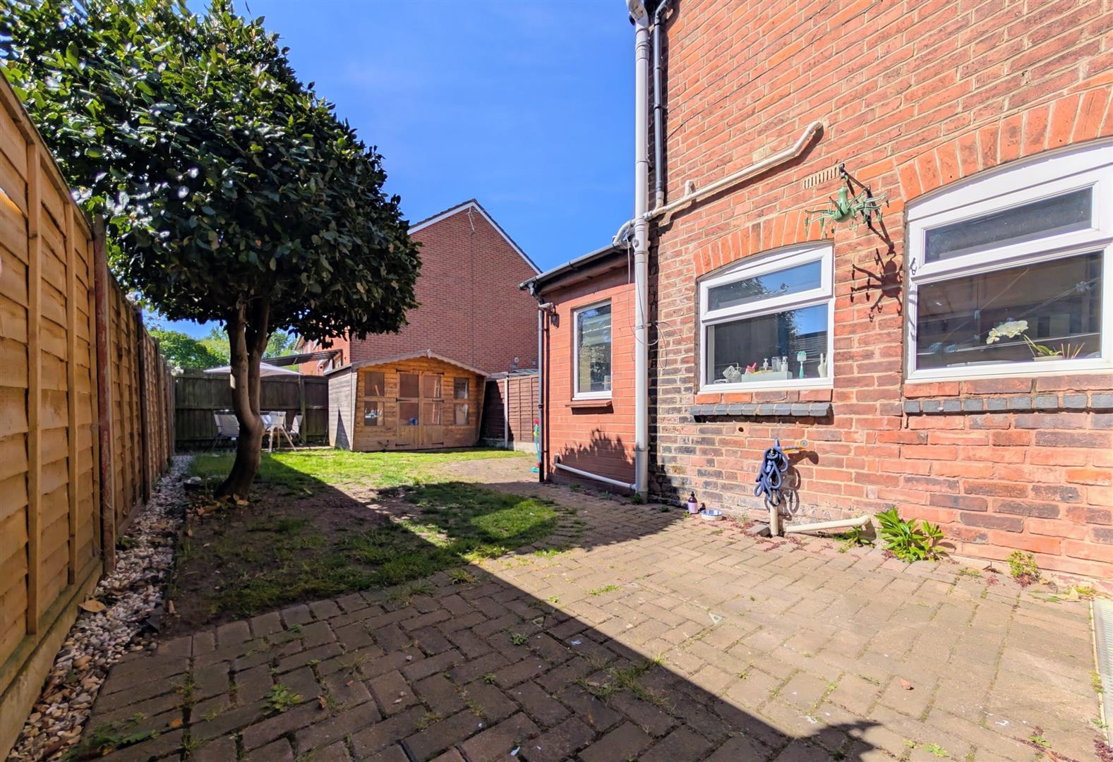 Outside - To the side of the property there is a paved garden area which leads via wooden built gates to the rear where there is a lawn, storage shed and a patio surrounded by fencing.