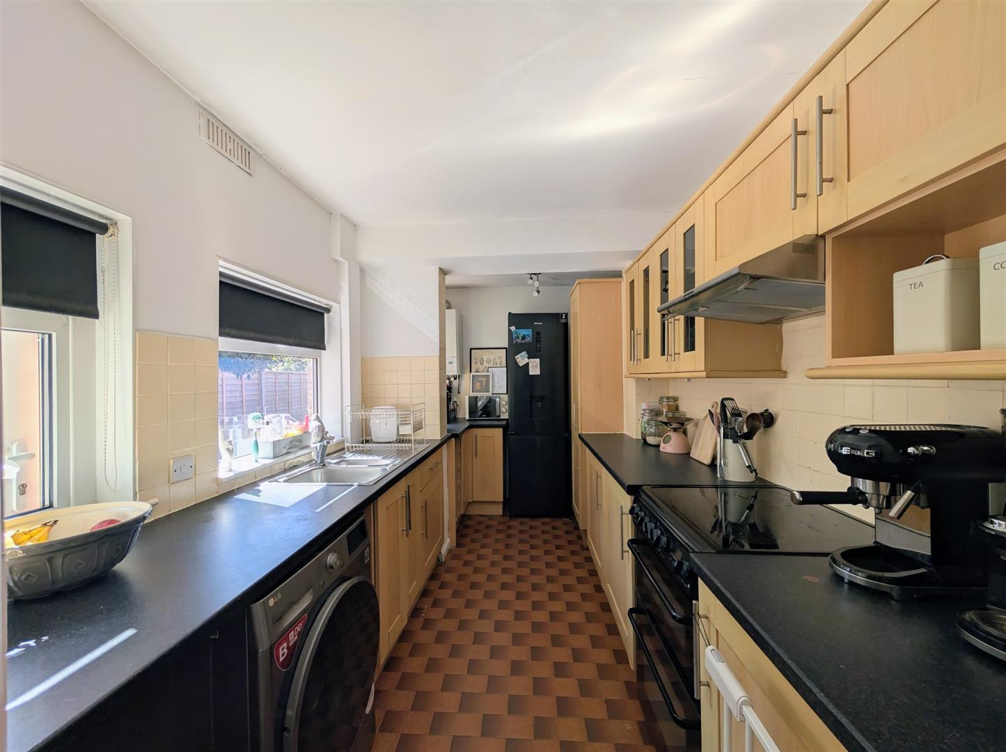 Kitchen - 4.09m x 2.21m max (13'5 x 7'3 max) - Base and wall mounted units, laminated worktops, tiled splashbacks, single drainer one and a half bowl sink unit with a mixer tap, space for fridge/freezer, plumbing for automatic washing machine, electric cooker point, extractor hood, wall mounted gas fired combination boiler, three upvc double glazed windows to side elevation.