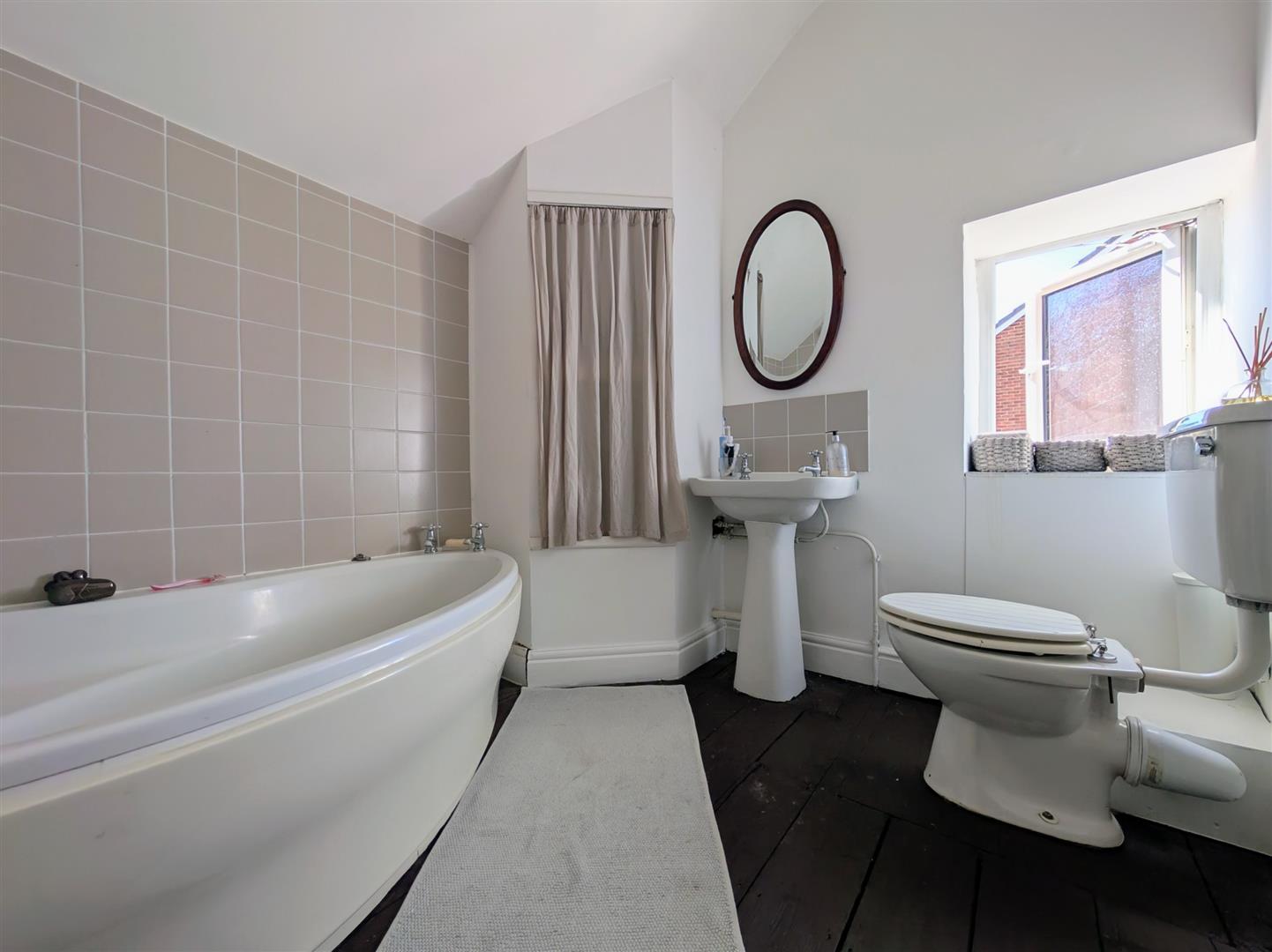 Bathroom - 2.29m x 2.21m max (7'6 x 7'3 max) - White suite comprising corner bath with a shower unit over, low level w.c., pedestal wash hand basin, partially tiled walls, single radiator, exposed floorboards, recess with slatted shelving and a single radiator, upvc double glazed window to rear elevation.