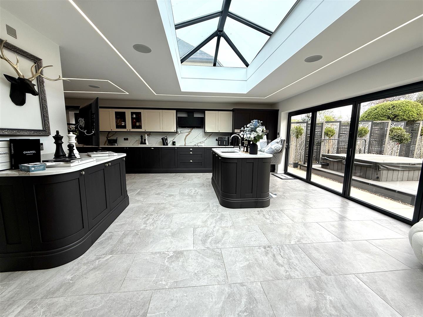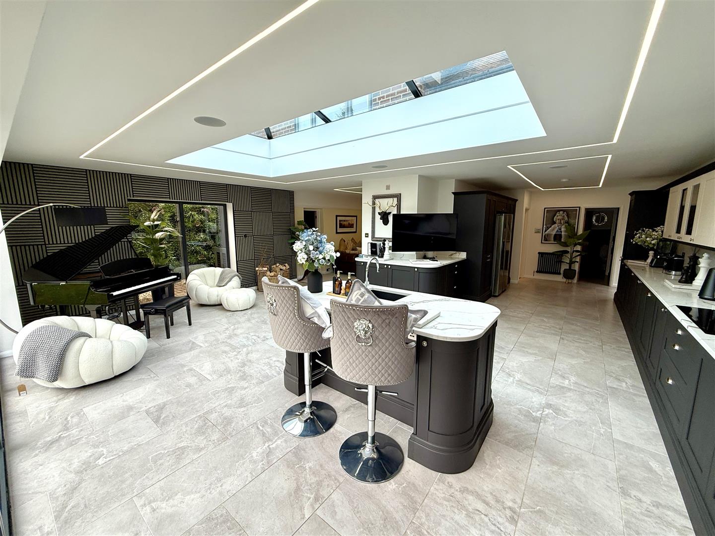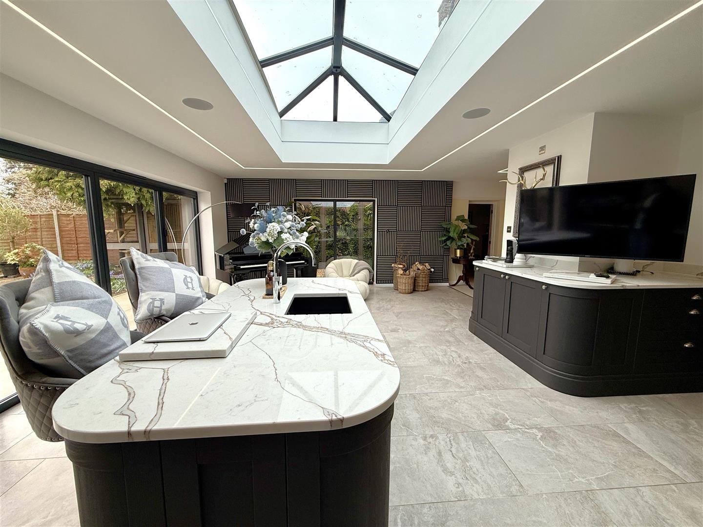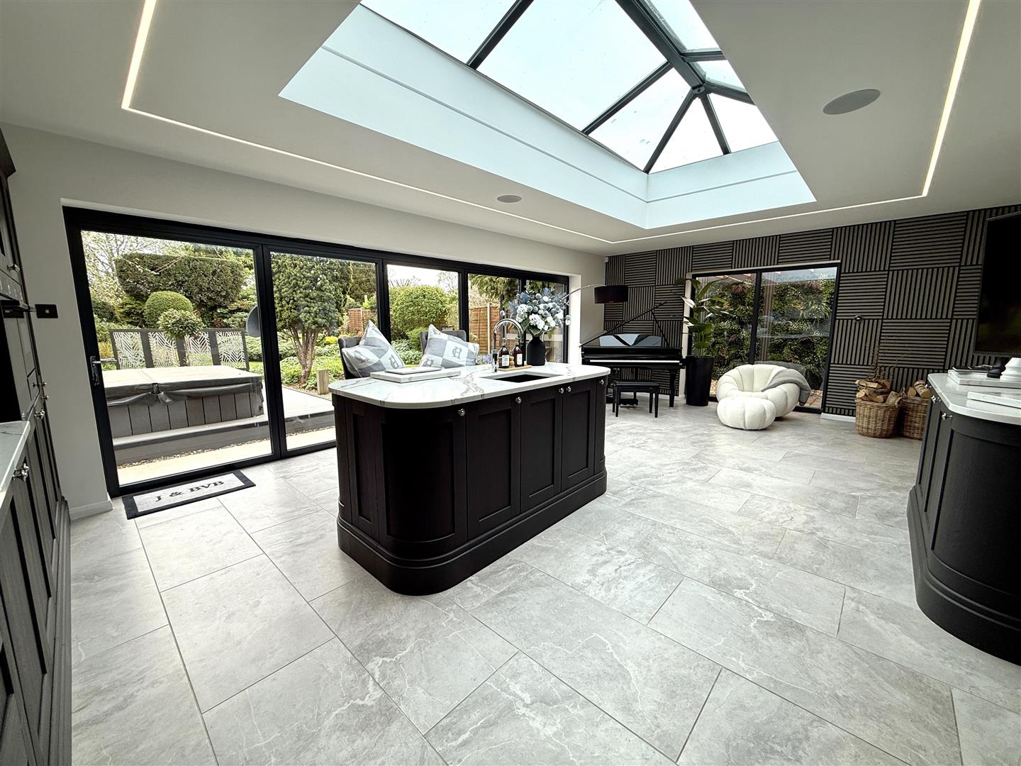 The Property - The kitchen / family / entertaining room is undoubtedly the heart of this beautiful home! The stylish cabinetry is finished off perfectly with marble work surfaces. There are an abundance of integrated appliances and a central island with large roof lantern above. Large bi-fold doors open onto the south facing rear garden, which is beautifully landscaped. There is a sitting room adjacent and a separate lounge and office.