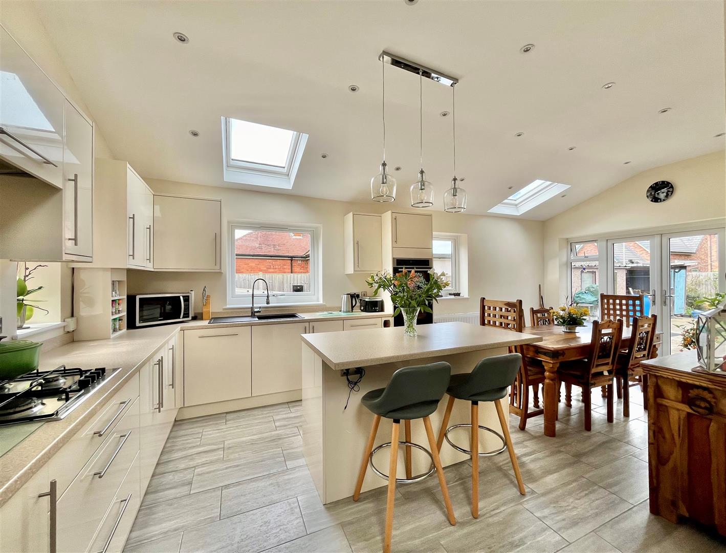 Spacious Open Plan Kitchen/Diner/Family Room - 6.58m x 5.33m max (21'7 x 17'6 max) - A range of base and wall mounted units, laminated worktops and splashbacks, single drainer sink unit with a chrome mixer tap, built in electric double oven, four burner gas hob and extractor hood, built in dishwasher, wine rack, plumbing for automatic washing machine, island unit with a breakfast bar, downlighters, tiled floor, upvc double glazed windows to front, side and rear elevations, matching patio doors to rear elevation, three Velux roof light.