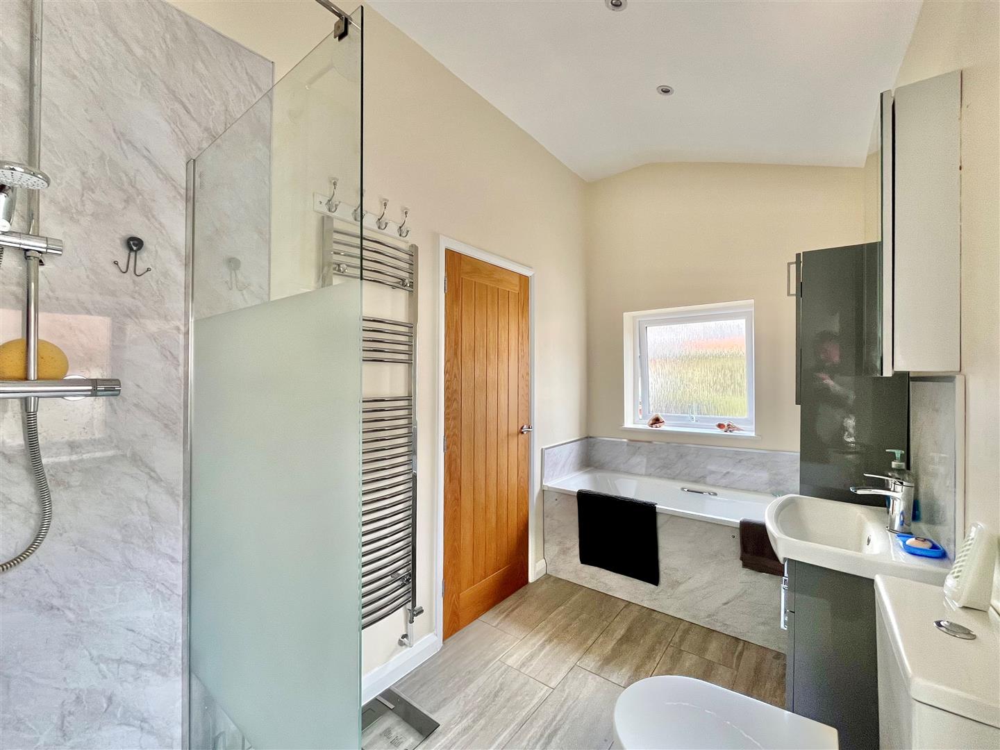 Bathroom - 3.43m x 1.70m (11'3 x 5'7) - White suite comprising panelled bath with a mixer tap, walk in shower enclosure and unit, low level w.c., wash hand basin with a mixer tap and cupboard below, tiled floor, chrome heated towel rail, lowlighters, extractor fan, upvc double glazed windows to side and rear elevations.