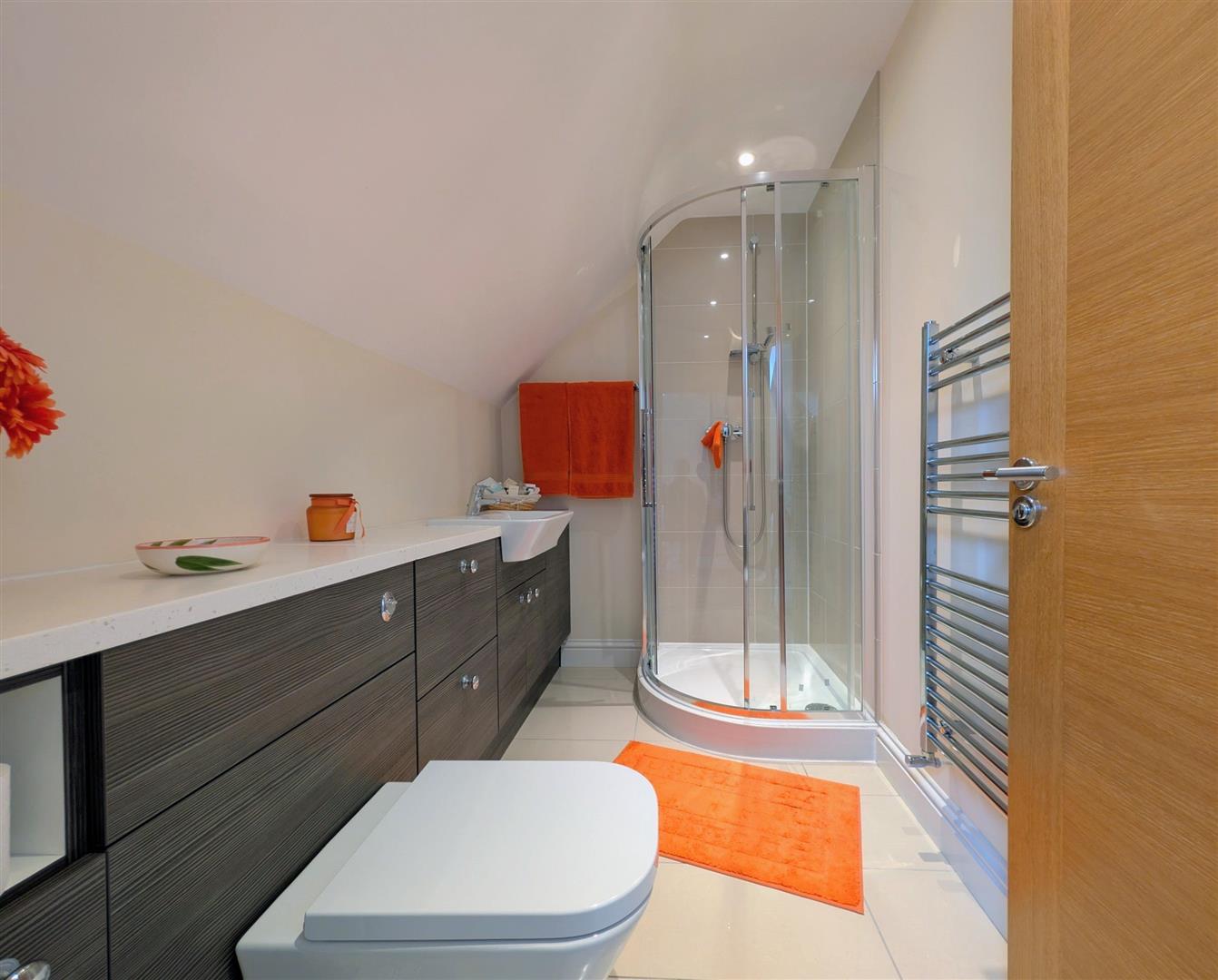 En-Suite Shower Room - 2.54m x 1.63m (8'4 x 5'4) - Corner shower enclosure and unit, pedestal wash hand basin with a mixer tap, laminated worksurface and cupboard below, low level w.c., chrome heated towel rail, High Gloss tiled floor, downlighters, extractor fan.