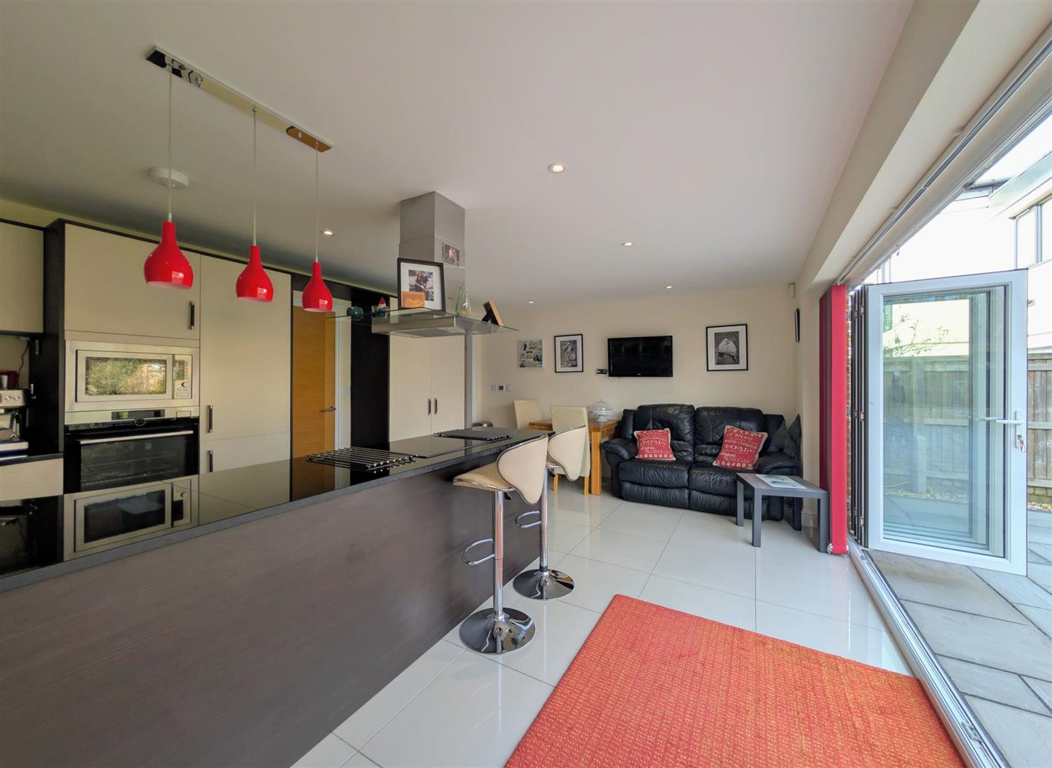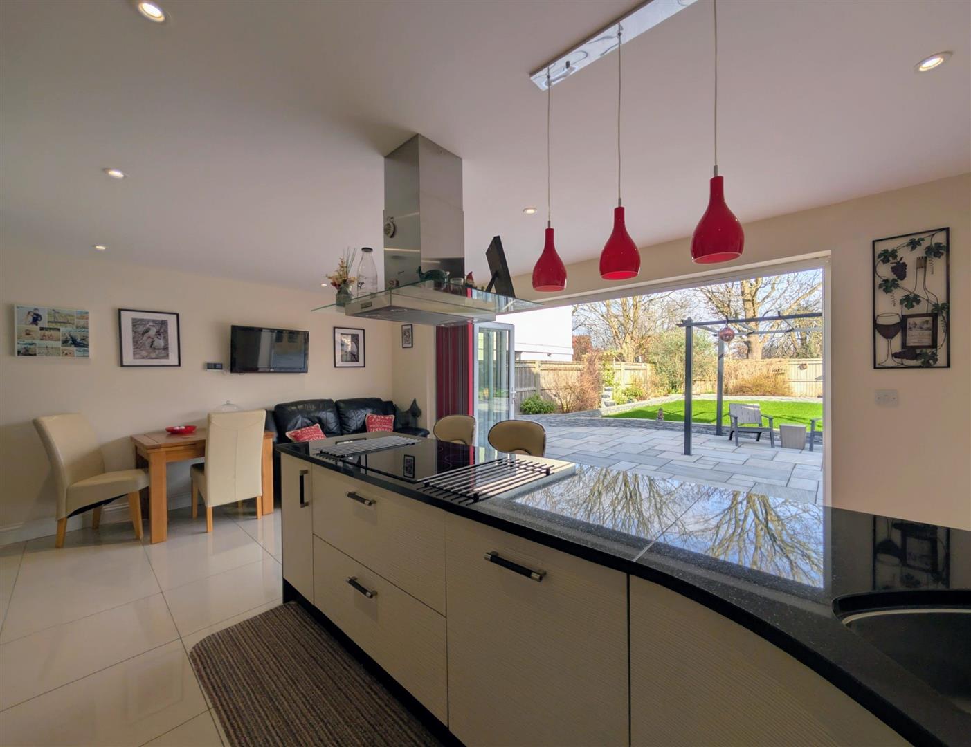 Kitchen/Diner - 5.69m x 4.14m max (18'8 x 13'7 max) - Base and wall mounted units, granite worktops, one and a half bowl stainless steel sink unit with a mixer tap, built in fridge/freezer, oven, microwave combination, dishwasher, induction hob and extractor hood, High Gloss tiled floor, space for a table and chairs and a sofa, tv point, downlighters, bifold doors onto the patio.