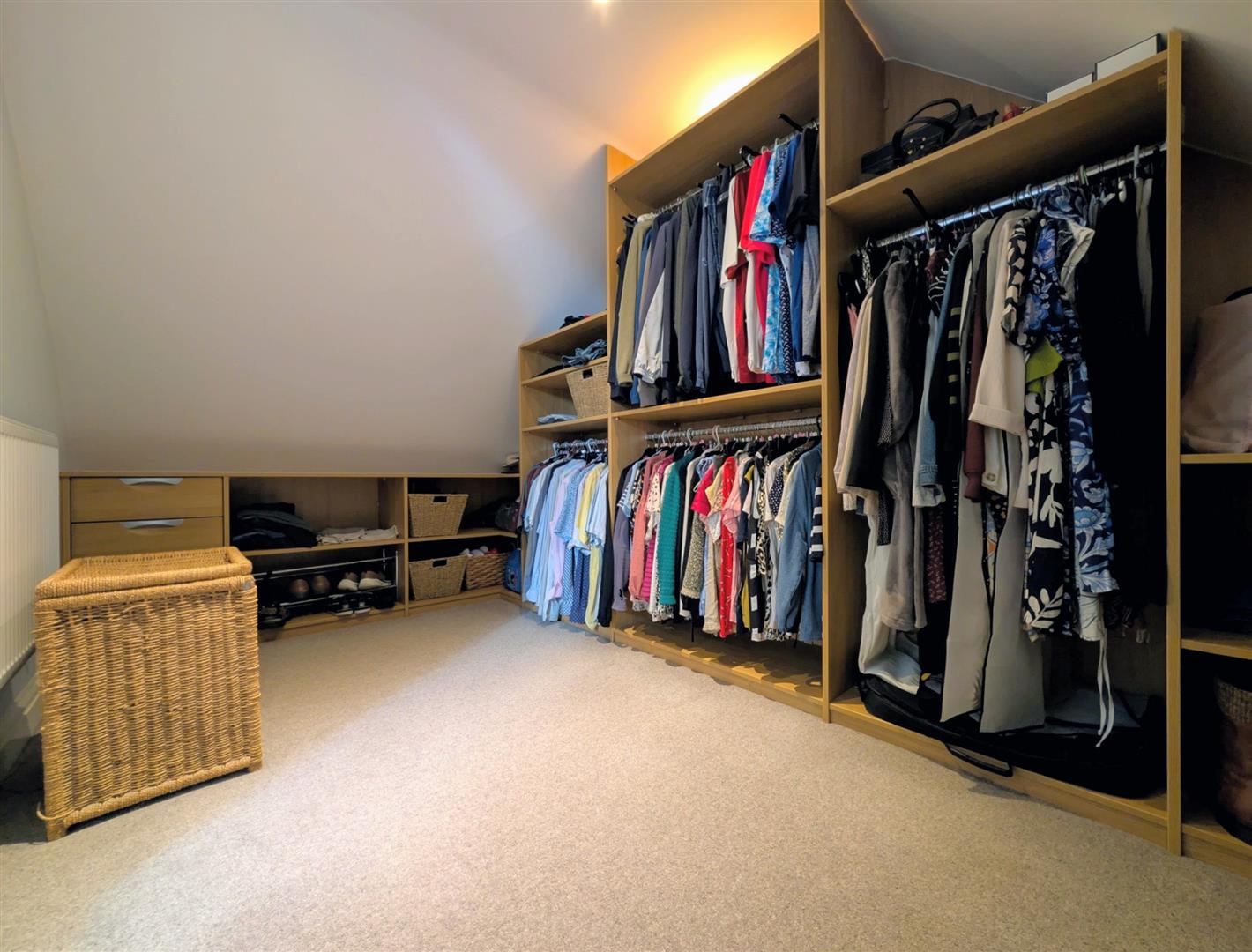 Dressing Room - 4.14m x 2.31m max (13'7 x 7'7 max) - Hanging space, shelving, chest of drawers, single radiators, downlighters.