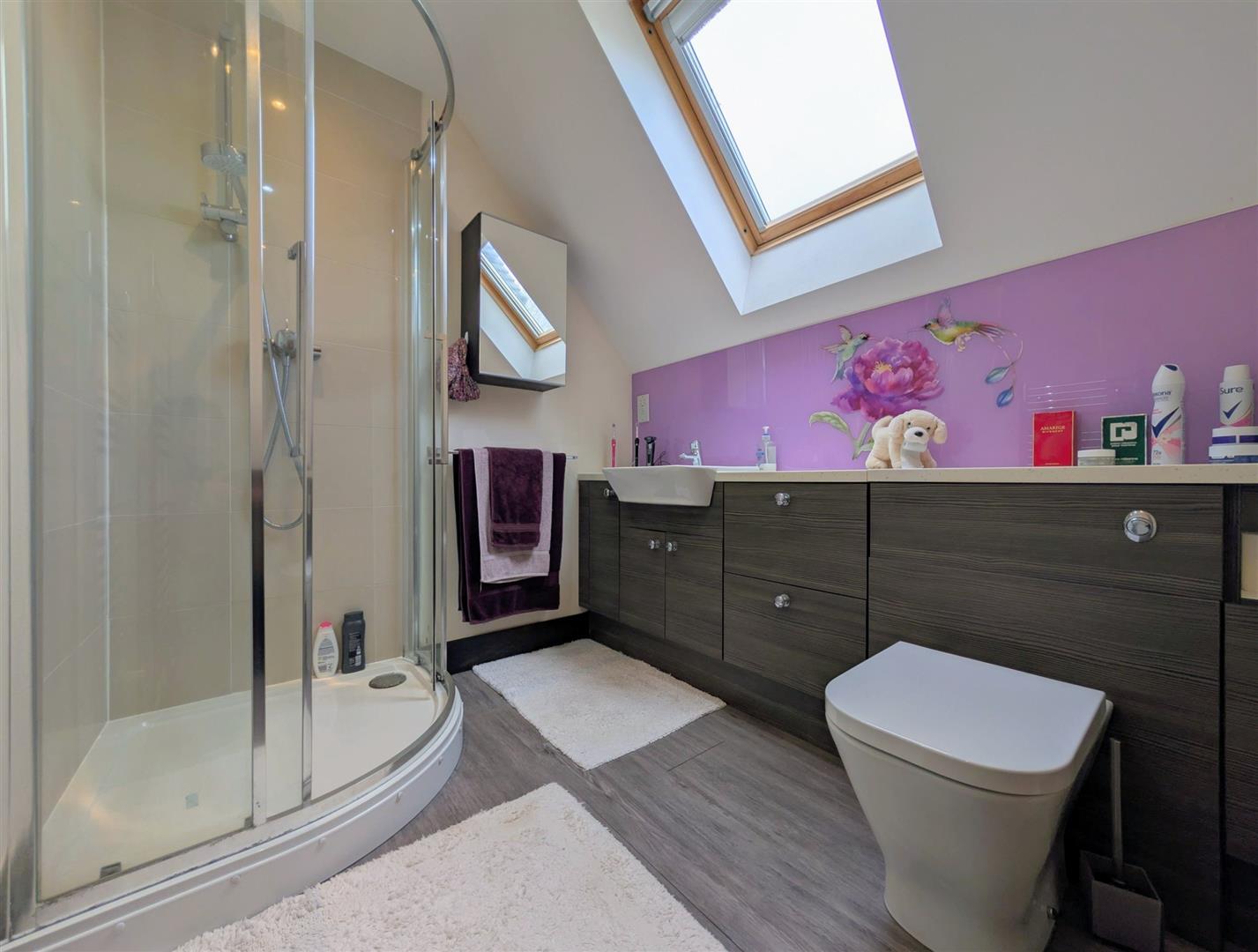 En-Suite Shower Room - 2.44m x 1.96m (8' x 6'5) - Corner shower enclosure and unit, wash hand basin with a mixer tap, worksurface and cupboards below, low level w.c., chrome heated towel rail, extractor fan, downlighters, roof light.