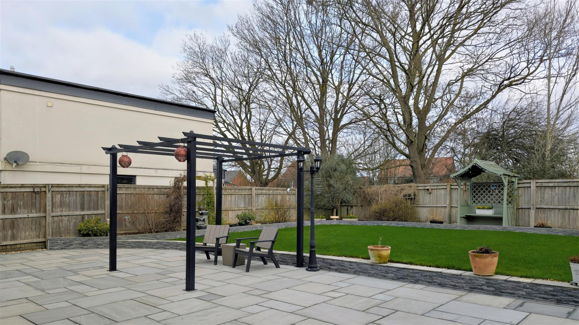 To the rear there is a level landscaped garden measuring approaching 50ft in length with a substantial paved patio that leads onto the rest of the garden which is laid to lawn with raised borders, plants, bushes and a summerhouse all enclosed by panelled fencing.