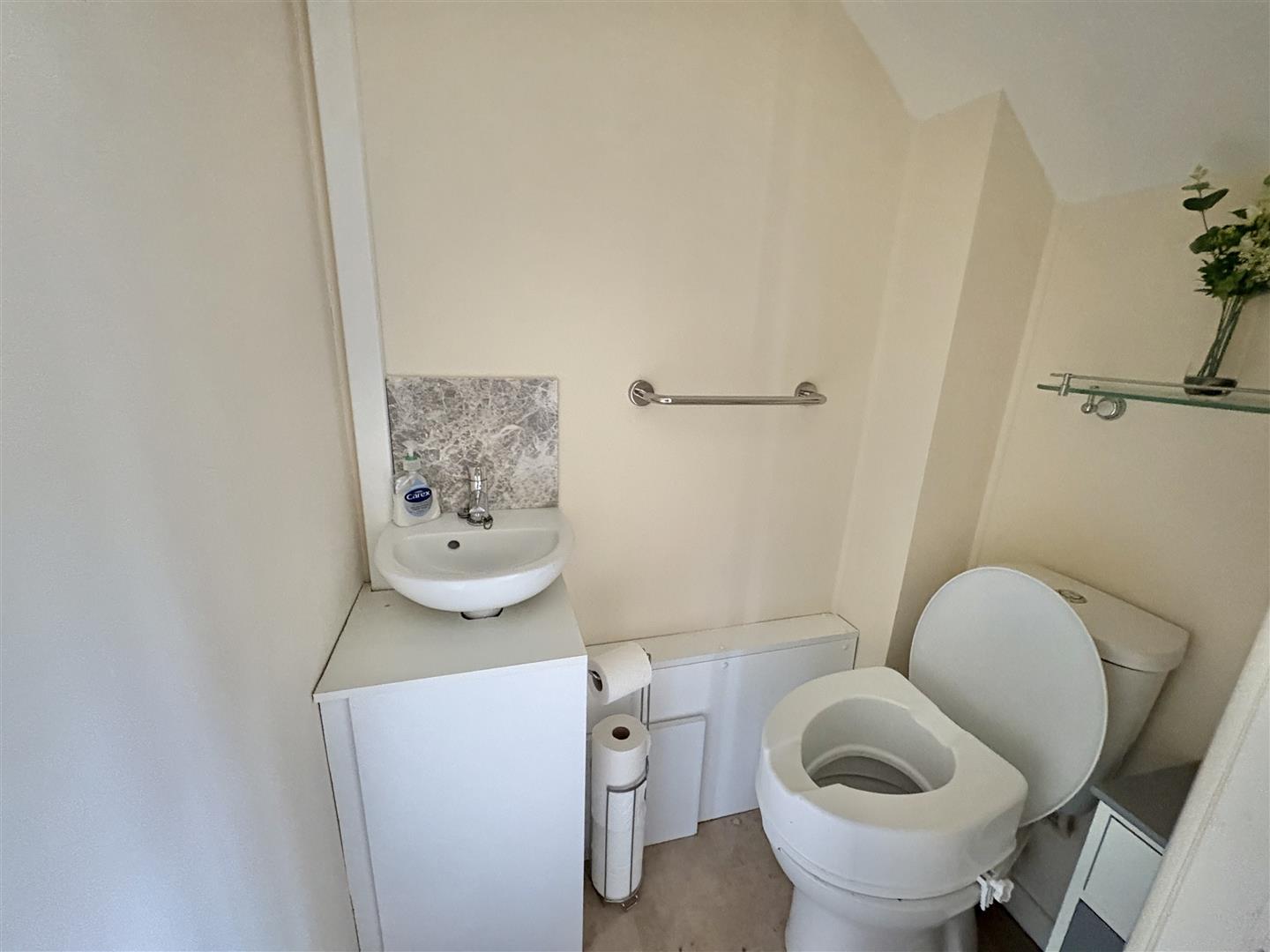 Cloakroom - White suite comprising low level w.c., wall mounted wash hand basin with a tiled splashback.