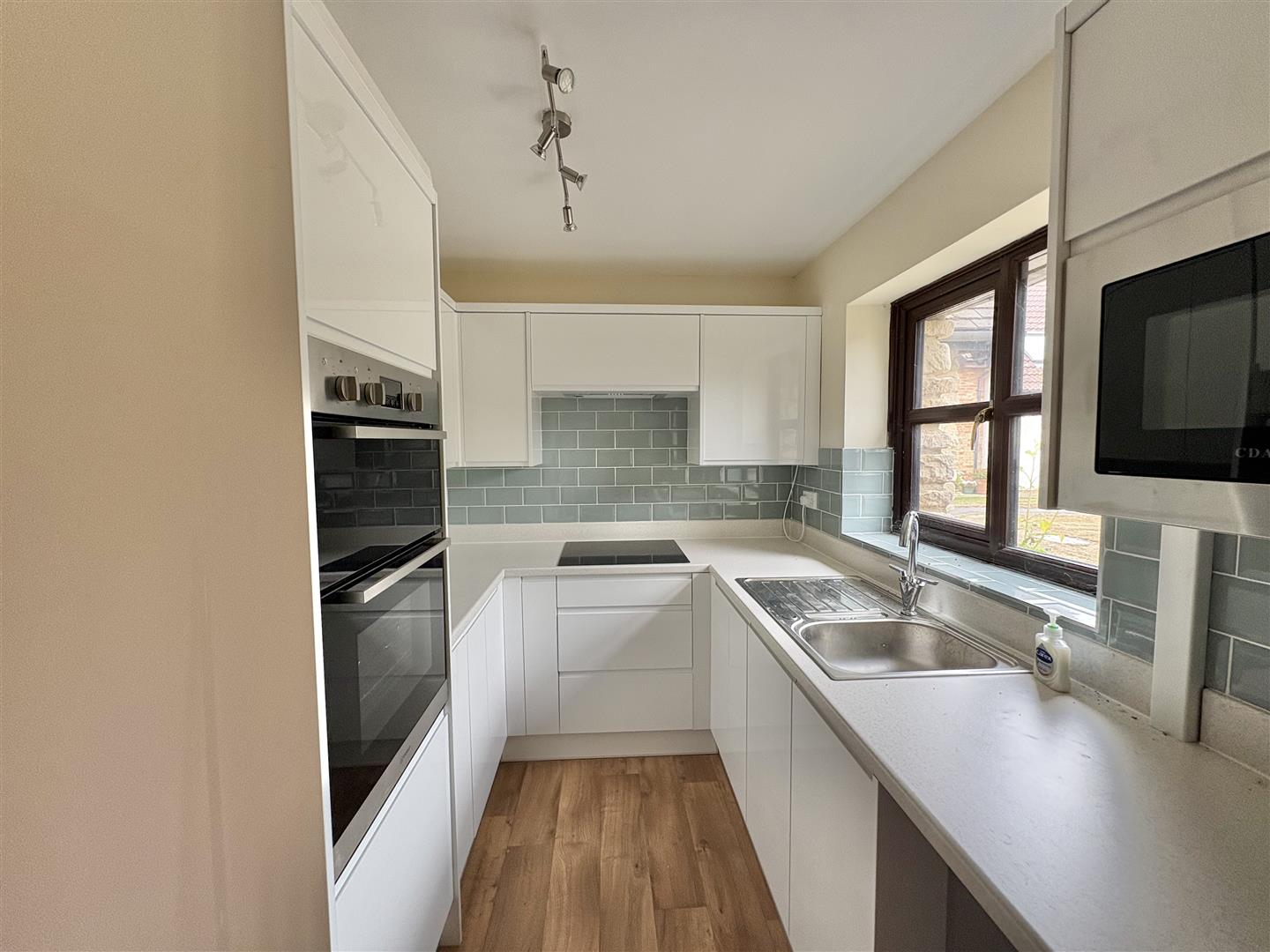 Kitchen - 2.69m x 2.06m (8'9" x 6'9" ) - Modern white High Gloss kitchen comprising or a range of base, drawer and wall mounted units, roll edge worksurface, stainless steel sink and drainer unit with a mixer tap, tiled splashbacks, double oven, electric hob with extractor fan over, built in microwave, space for larder style fridge/freezer, space for tumble dryer, upvc double glazed window to front aspect.
