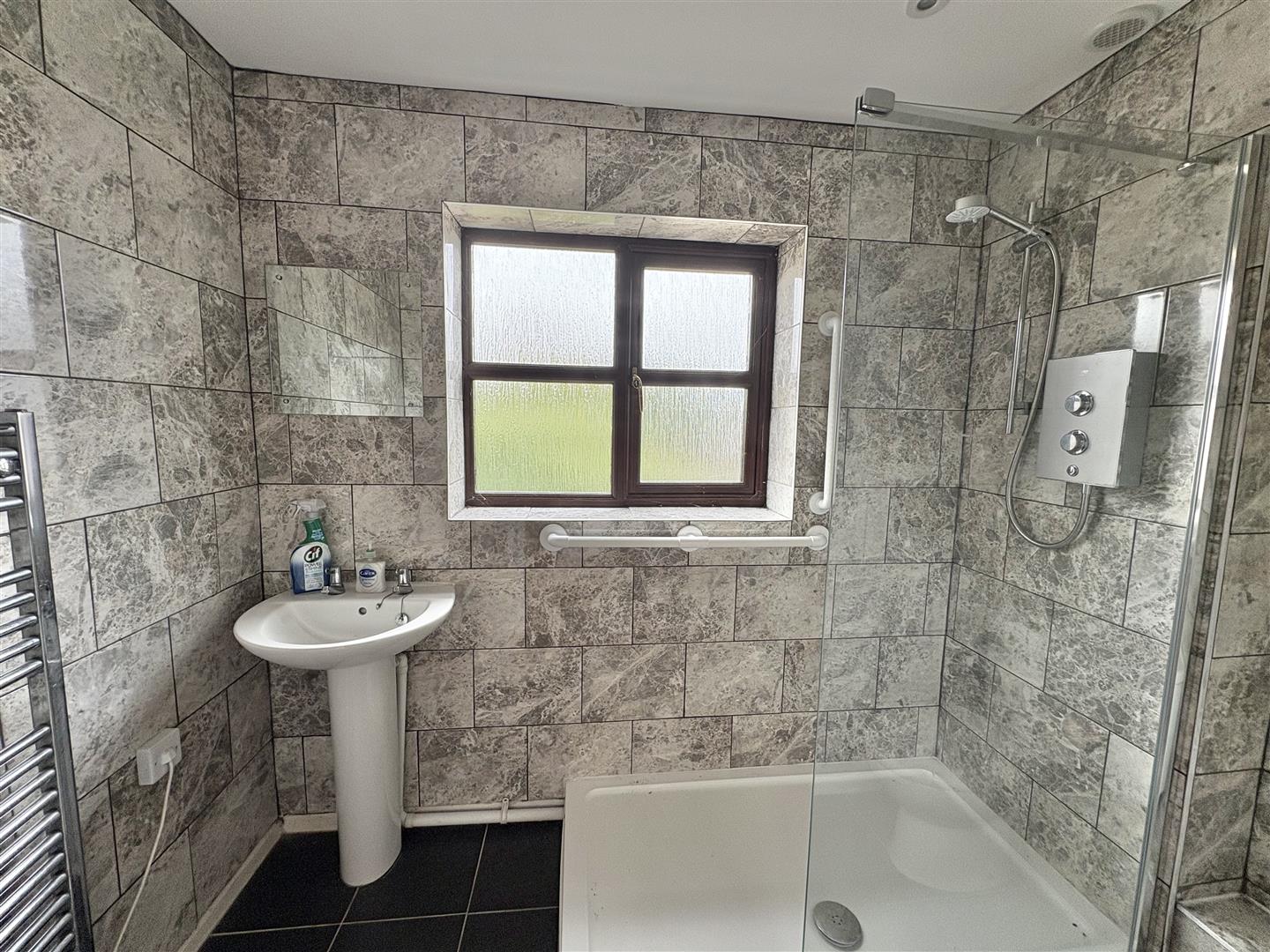 Shower Room - Modern white suite comprising close coupled w.c., pedestal wash hand basin, walk in double shower unit, fully tiled walls, chrome wall mounted heated towel rail, upvc double glazed opaque window to front aspect.