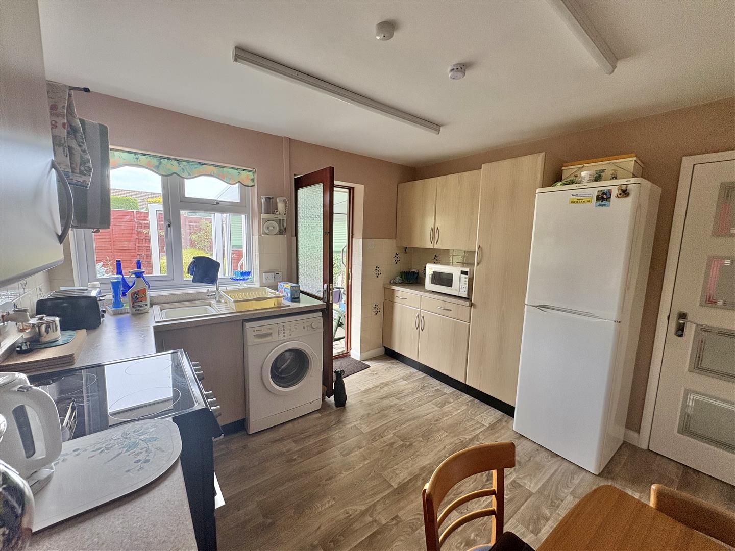 Kitchen/Breakfast Room - 3.36m x 3.27m (11'0" x 10'8") - Light oak coloured fitted kitchen comprising a range of base, drawer and wall mounted units, roll edge worksurfaces, tiled splashbacks, space for larder style fridge/freezer, space and plumbing for automatic washing machine, space for a gas cooker, radiator, part glazed door leads through to: