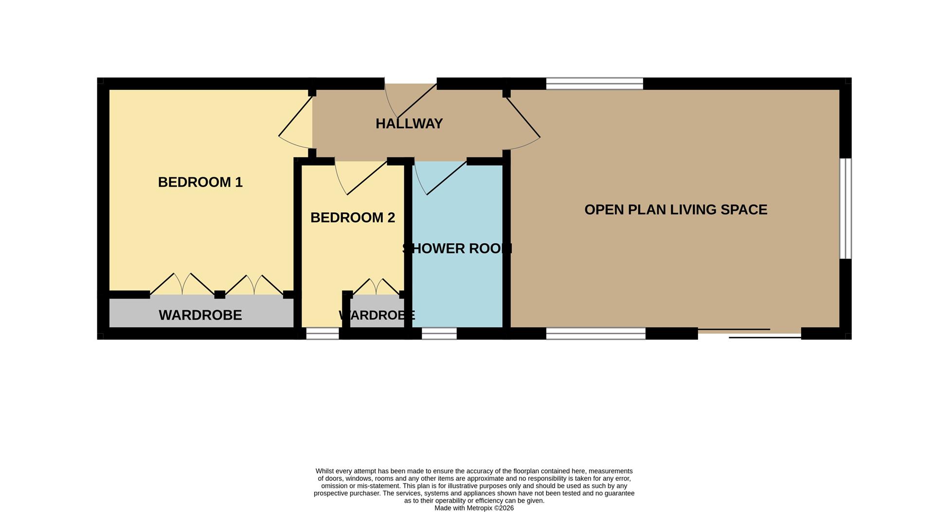 Accommodation comprises hallway, 16FT OPEN PLAN LIVING SPACE, bedroom one with fitted wardrobes, bedroom two with fitted wardrobes and the shower room with a DOUBLE WALK IN ENCLOSURE.