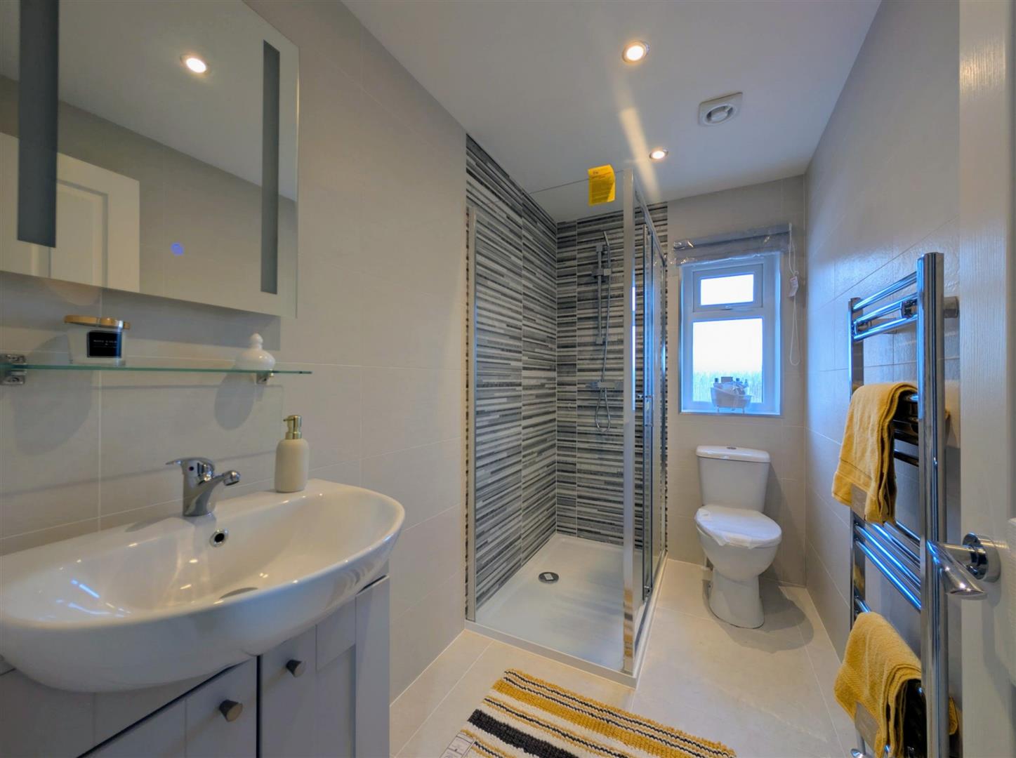 Shower Room - 2.59m x 1.40m (8'6 x 4'7) - Double walk in shower enclosure and unit, low level w.c., wash hand basin with a mixer tap and cupboard below, chrome heated towel rail, fully tiled walls, downlighters, extractor fan, upvc double glazed window to rear elevation.