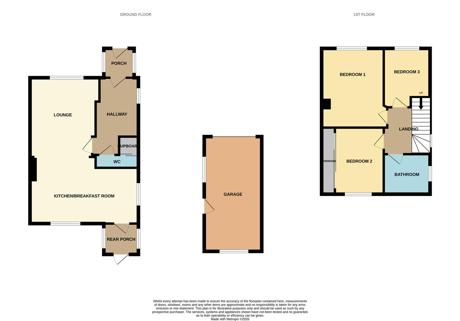 Accommodation comprises porch, hallway, cloakroom, lounge that opens to the fitted kitchen, rear porch/utility, bedroom one, bedroom two with FITTED WARDROBES, bedroom three and the bathroom with a modern white suite.