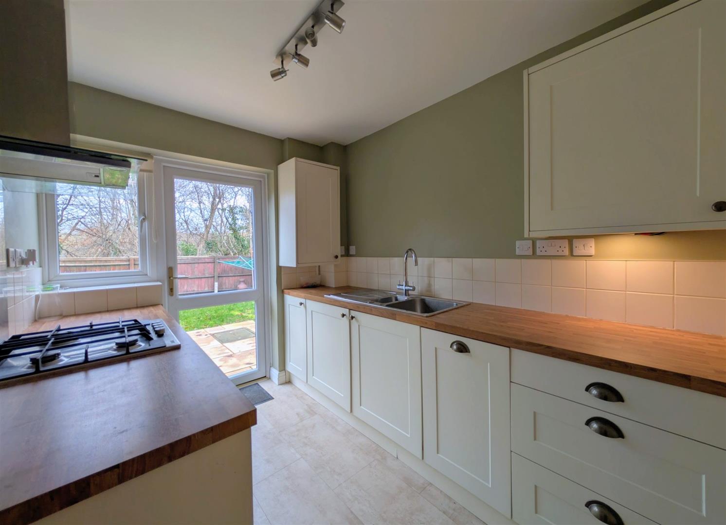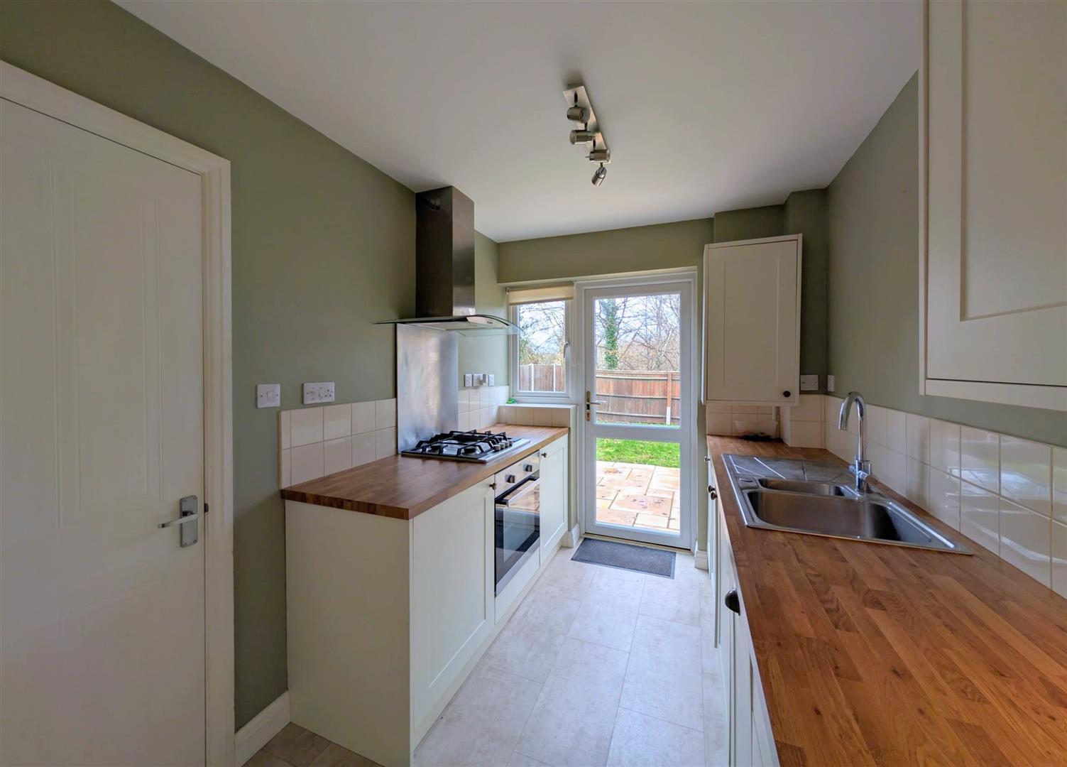 Kitchen - 3.96m x 2.13m max (13' x 7' max) - Modern base and wall mounted units, laminated worktops, tiled splashbacks, single drainer one and a half bowl stainless steel sink unit with a chrome mixer tap, built in electric oven, four burner gas hob and extractor hood, built in washing machine, built in dishwasher, built in fridge and freezer, cupboard housing the gas fired combination boiler, single radiator, understairs storage cupboard, upvc double glazed window and door to rear elevation onto the patio.