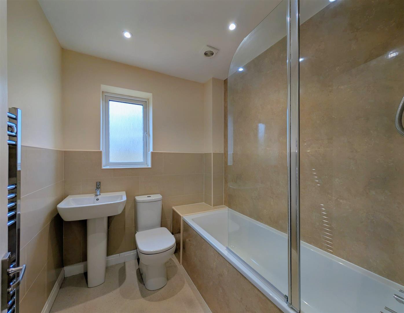 Bathroom - 1.98m x 1.88m (6'6 x 6'2) - White suite comprising panelled bath with a shower unit over, low level w.c., pedestal wash hand basin with a mixer tap, partially tiled walls, chrome heated towel rail downlighters, extractor fan, upvc double glazed window to rear elevation.