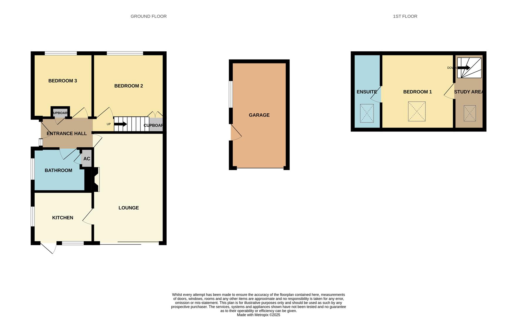 Accommodation comprises hallway, LOUNGE with PATIO DOORS onto the DECKING, fitted kitchen with built in appliances, bedroom two with a BUILT IN STORAGE CUPBOARD, bedroom three, bathroom with a white suite and an airing cupboard, STUDY AREA with a roof light, bedroom one with a roof light and the en-suite shower room.