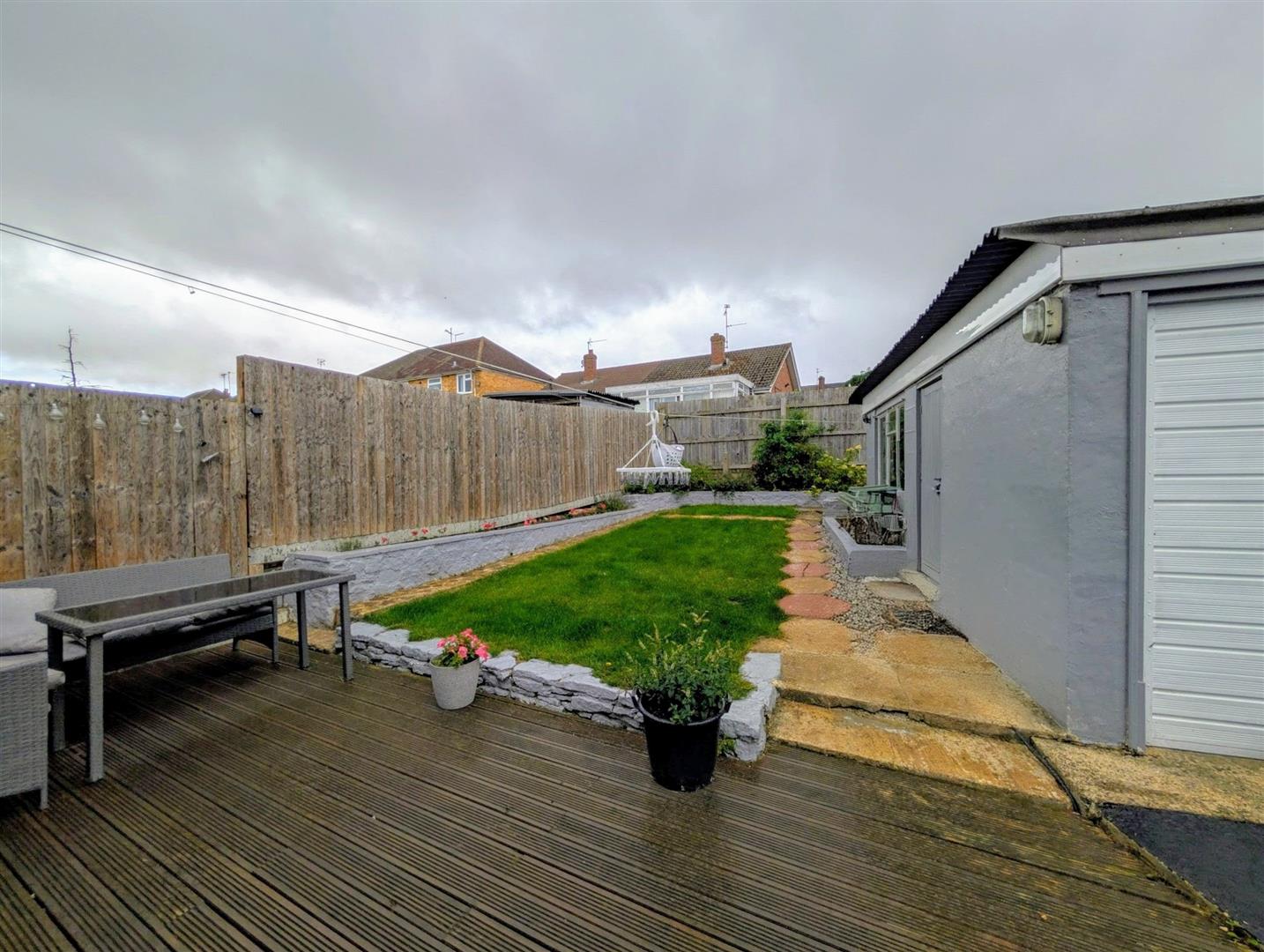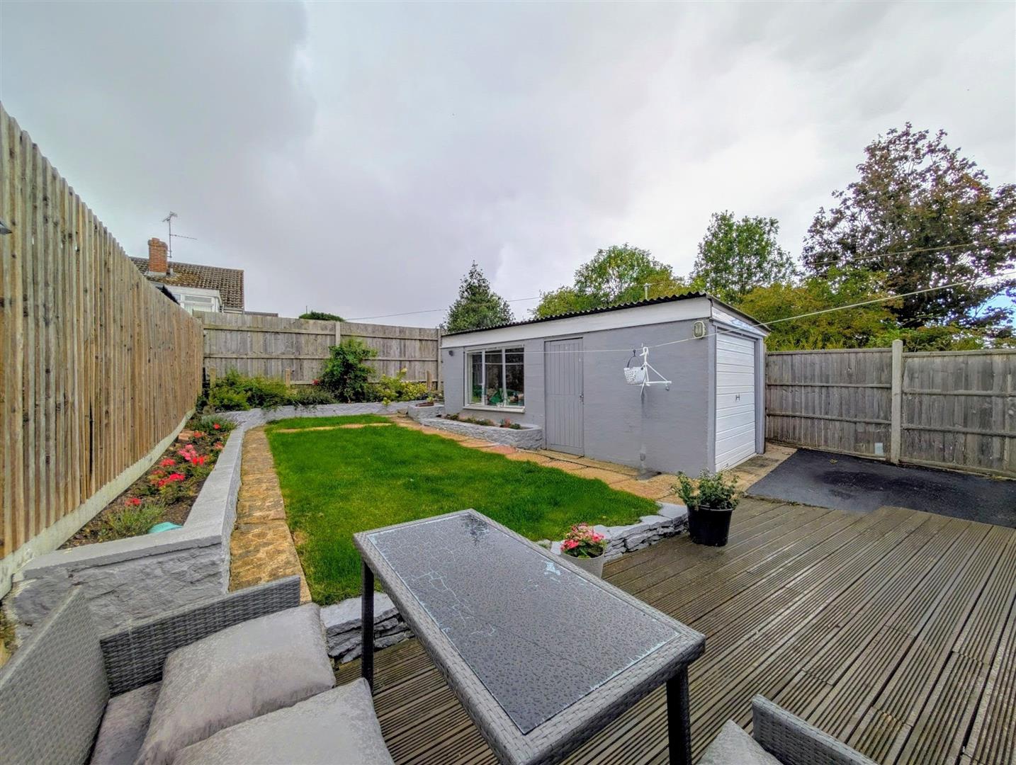 The rear garden is mainly laid to lawn with a wooden decked patio, raised flower borders, plants and bushes all surrounded by panelled fencing.