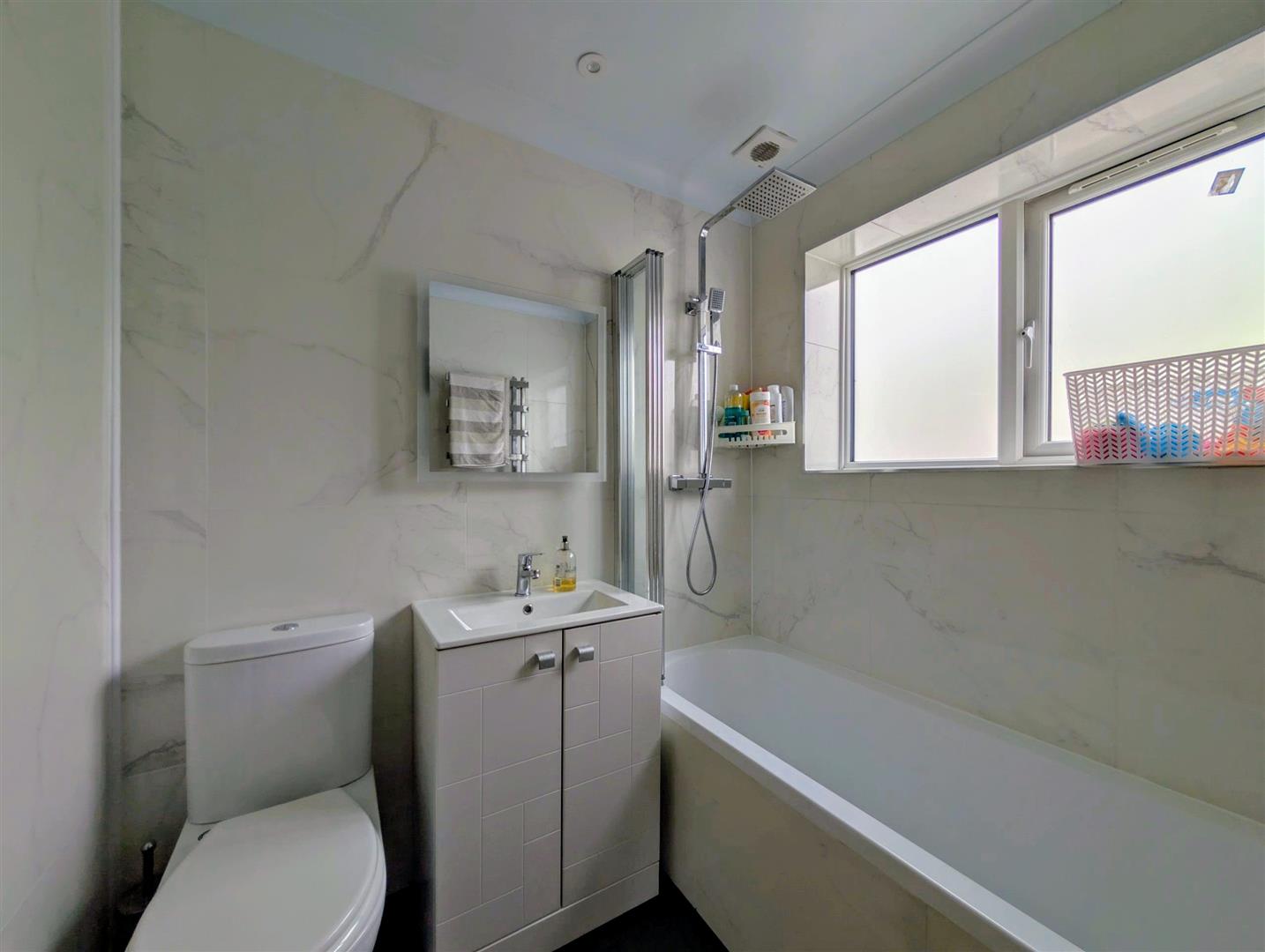 Bathroom - 2.21m x 1.63m max (7'3 x 5'4 max) - White suite comprising panelled bath with a mixer tap and shower unit over, low level w.c., wash hand basin with a mixer tap and cupboard below, built in storage cupboard, heated towel rail.