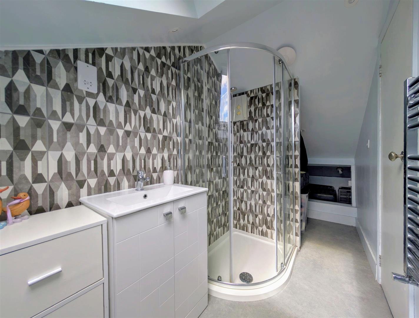 En-Suite Shower Room - 3.53m x 1.37m max (11'7 x 4'6 max) - Shower enclosure and unit, low level w.c., wash hand basin with a mixer tap and cupboard below, chrome heated towel rail, roof light.