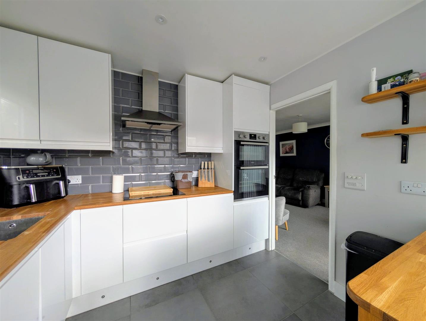 Kitchen - 2.67m x 2.36m (8'9 x 7'9) - Base and wall mounted units, hardwood worksurfaces, tiled splashback, single bowl sink unit with a mixer tap, built in electric double oven, induction hob, extractor hood and dishwasher, space for fridge/freezer, breakfast bar, downlighters, upvc double glazed windows to side and rear elevations, matching door to rear elevation.