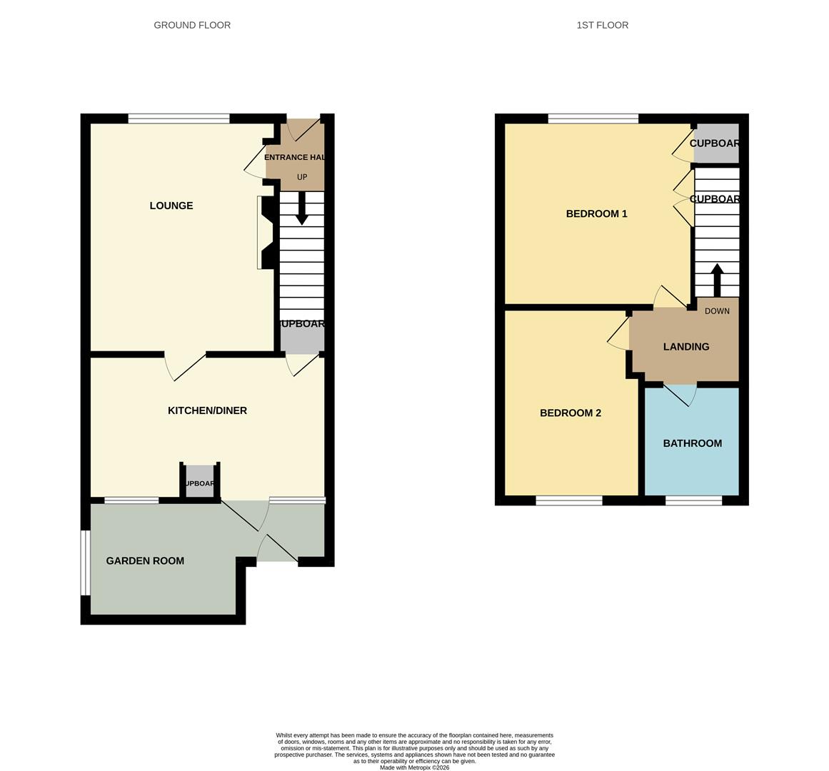Accommodation comprises hallway, lounge, fitted kitchen/diner, garden room with a door onto the garden, bedroom one with fitted cupboards, bedroom two and the bathroom with a white suite.