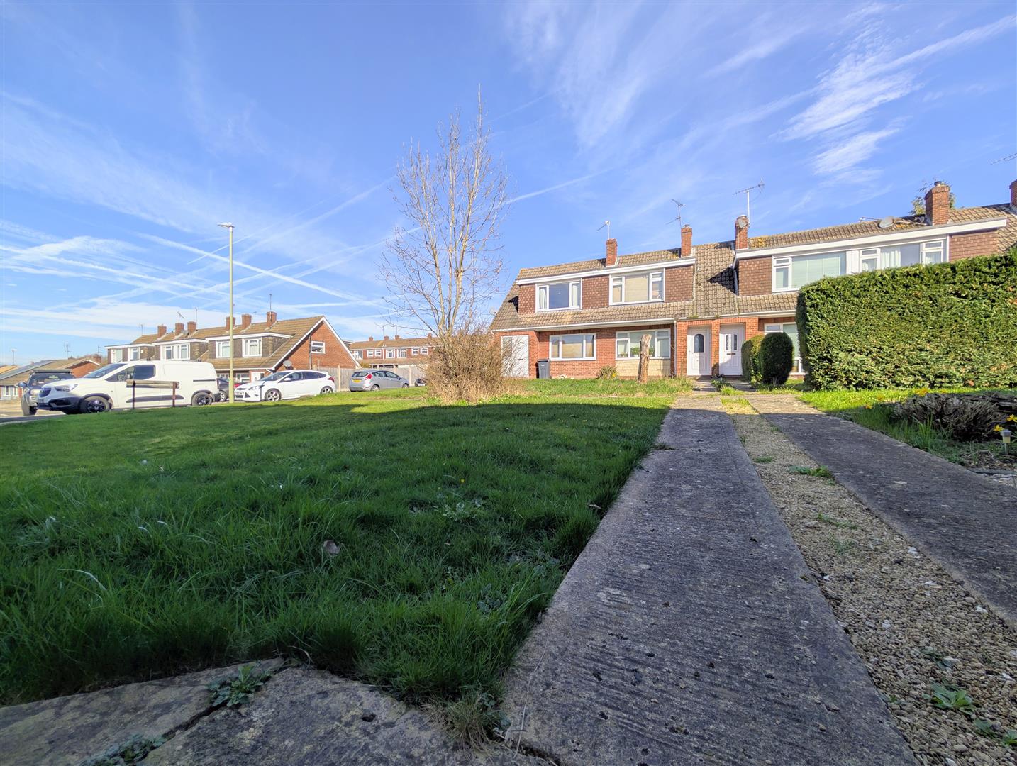 Outside - To the front there is a garden which is laid to lawn with a pathway leading to the front door.