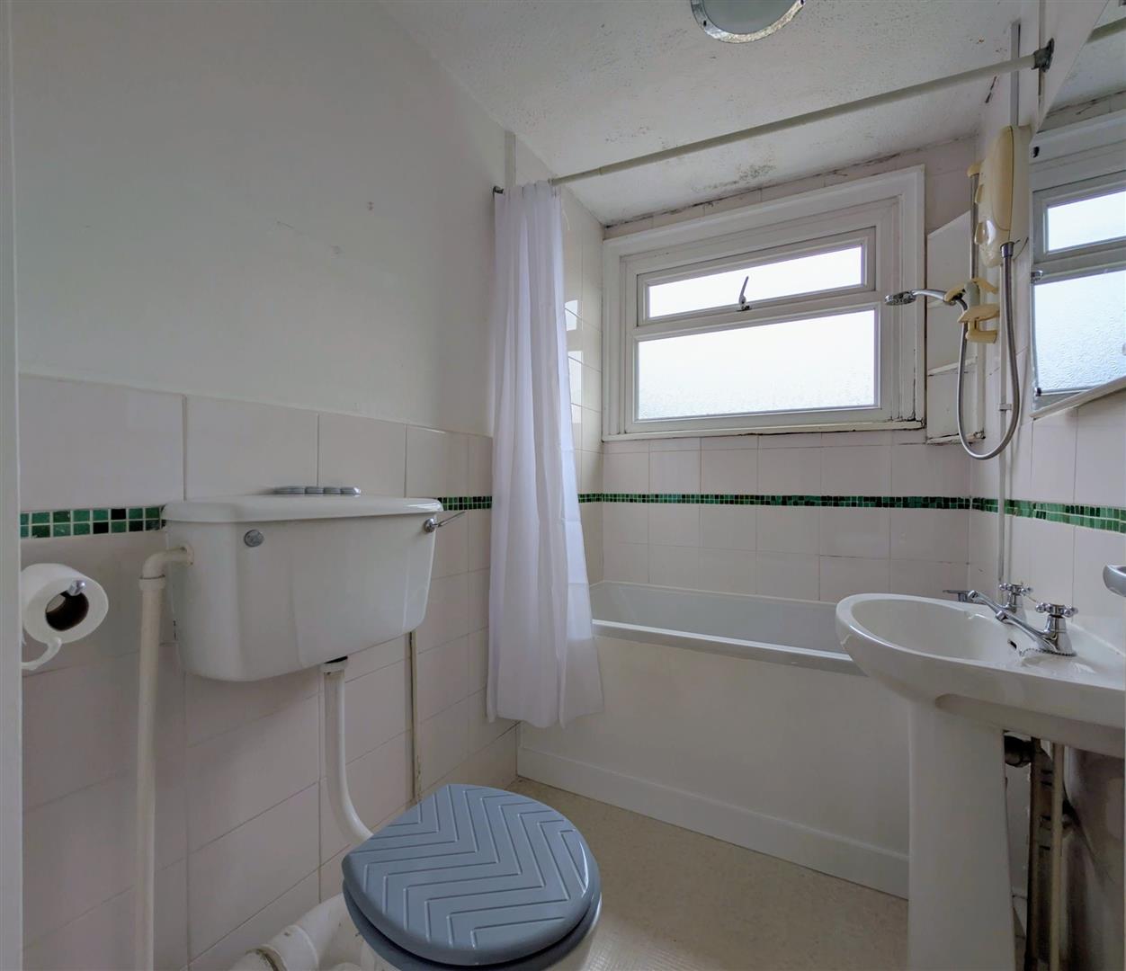 Bathroom - 2.16m x 1.45m (7'1 x 4'9) - White suite comprising panelled bath with a mixer tap and shower unit over, low level w.c., pedestal wash hand basin, partially tiled walls, single radiator, upvc double glazed window to rear elevation.