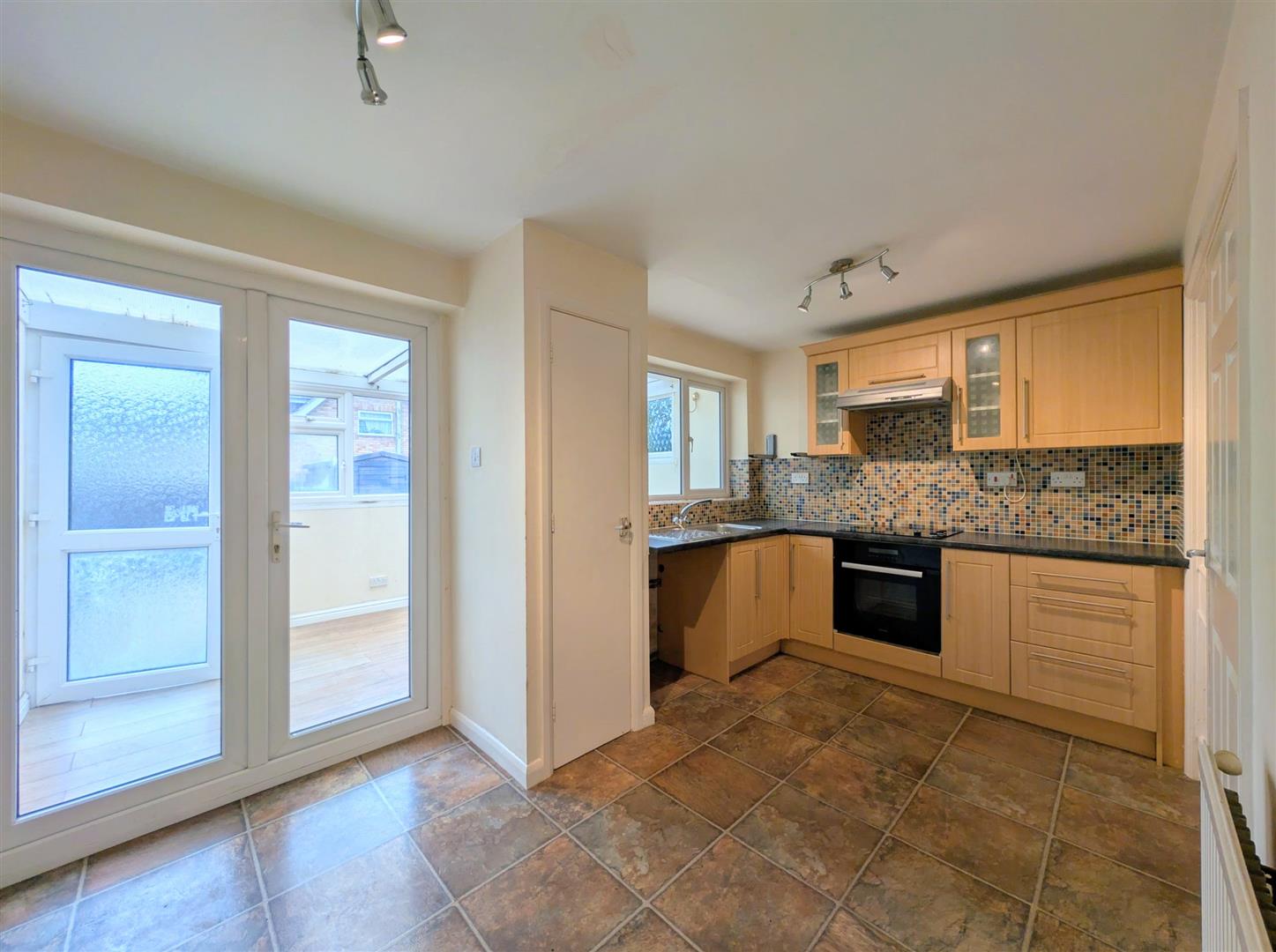 Kitchen/Diner - 4.19m x 2.36m max (13'9 x 7'9 max) - Base and wall mounted units, laminated worktops and tiled splashbacks, single drainer stainless steel sink unit with a mixer tap, built in electric oven, ceramic hob and extractor hood, built in storage cupboard, understairs storage cupboard, laminate flooring, single radiator, upvc double glazed window and French doors to rear elevation into the: