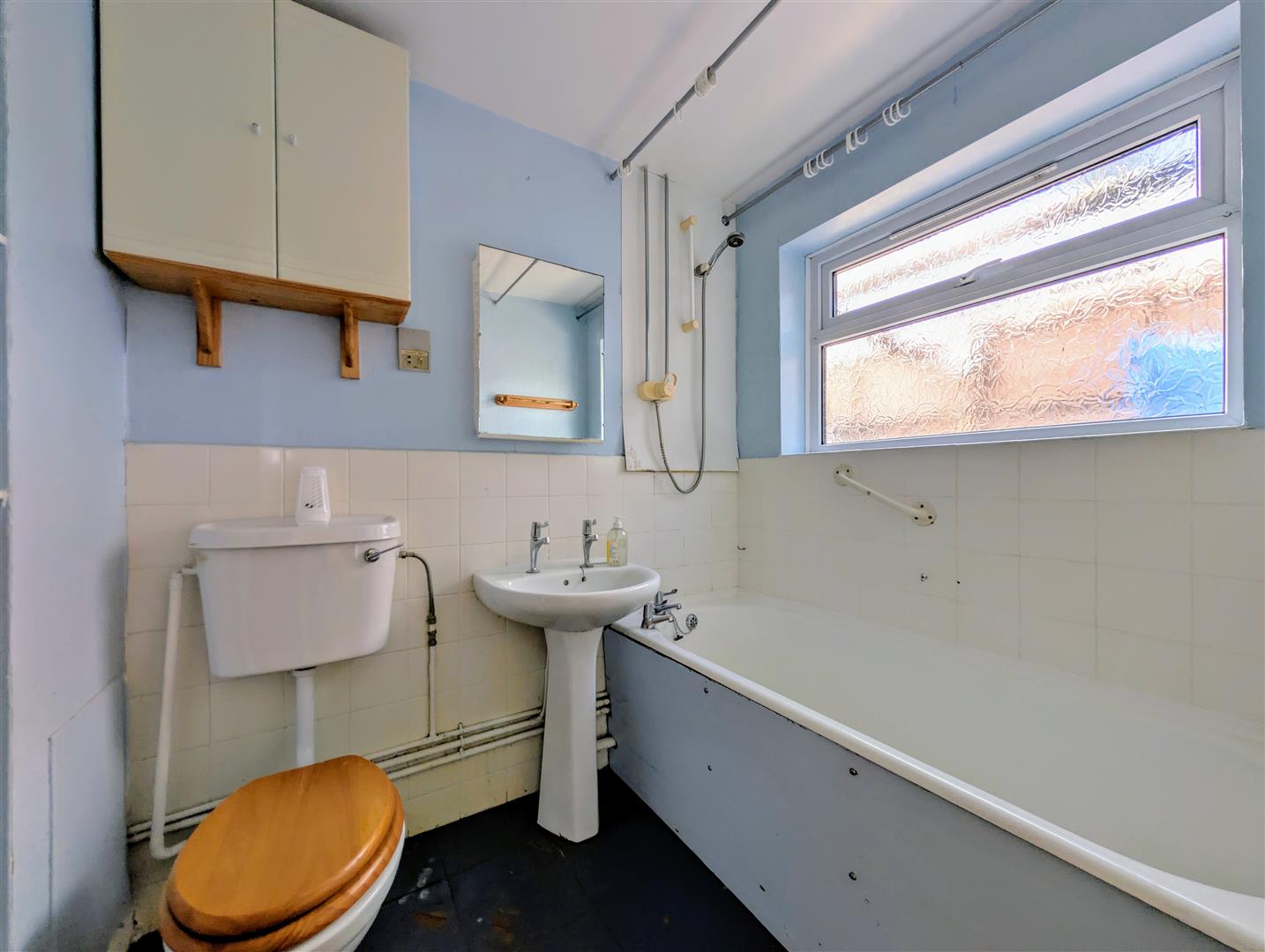 Bathroom - 1.96m x 1.63m (6'5 x 5'4) - White suite comprising panelled bath with a shower unit over, low level w.c., pedestal wash hand basin, built in storage cupboard, shaver point, upvc double glazed window to side elevation.
