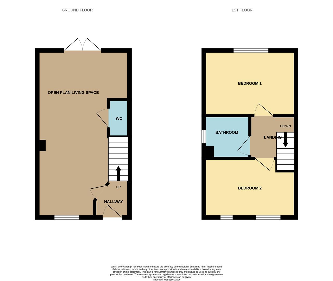 Accommodation comprises hallway, open plan living space with French doors onto the garden, cloakroom, two double bedrooms and the bathroom with a white suite.