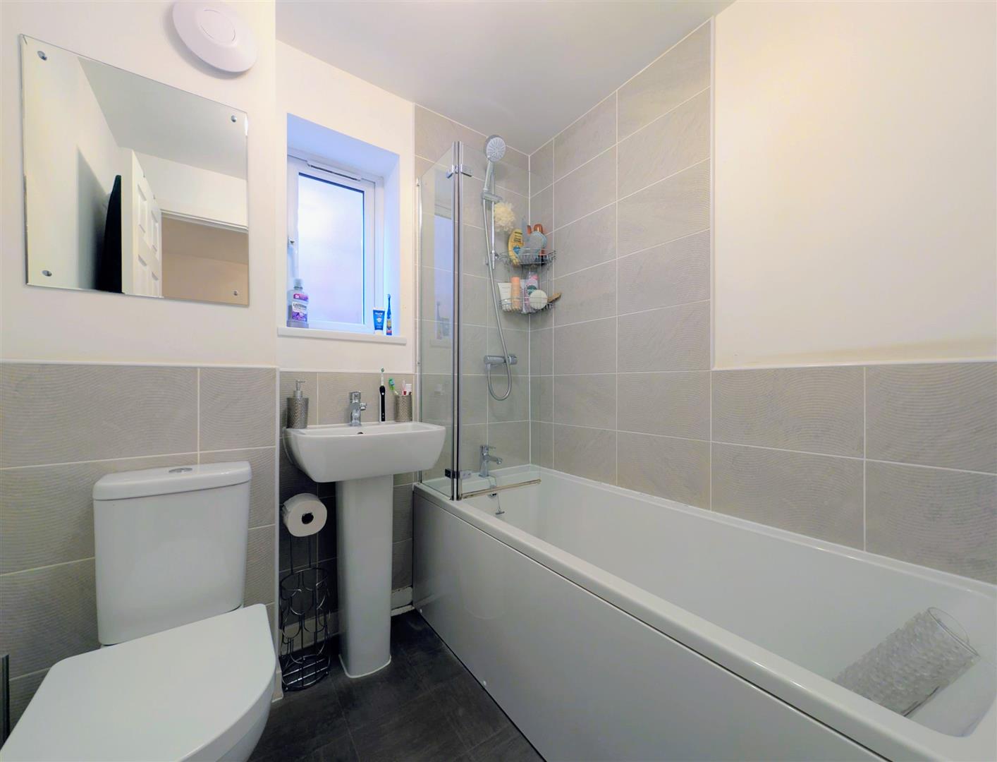 Bathroom - 1.88m x 1.68m max (6'2 x 5'6 max) - White suite comprising panelled bath with a mixer tap and shower unit over, low level w.c., pedestal wash hand basin with a mixer tap, partially tiled walls, single radiator, extractor fan, upvc double glazed window to side elevation.