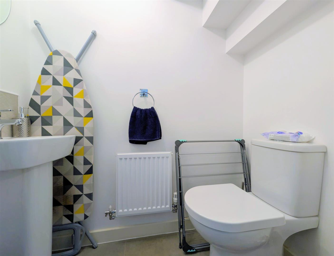 Downstairs Cloakroom - Low level w.c., pedestal wash hand basin with a mixer tap and tiled splashback, single radiator, extractor fan.