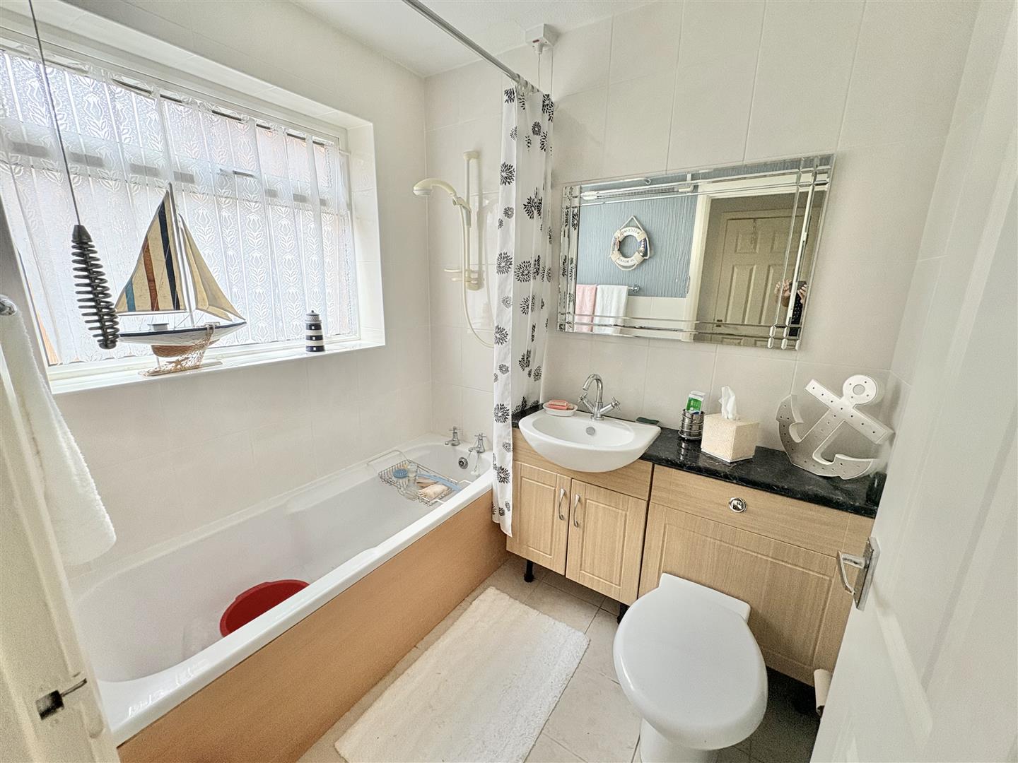 Bathroom - Modern close coupled w.c., wash hand basin with vanity unit below, panelled bath with electric shower over, fully tiled walls, shelving, towel rail, airing cupboard housing the Worcester combination boiler supplying domestic hot water and central heating installed in 2020, upvc double glazed opaque window to side aspect.