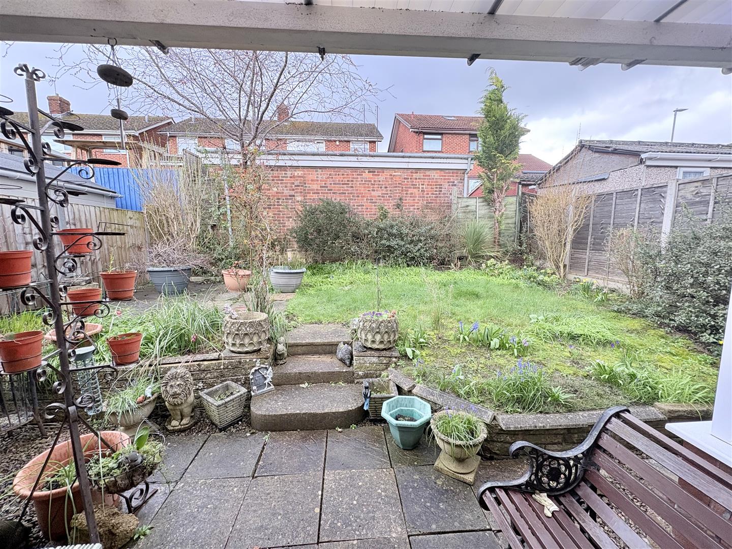 The garden to the rear is primarily laid with a paved patio, mature stocked bushes, shrubs and trees all surrounded by a combination of timber panel fencing and brick walling.