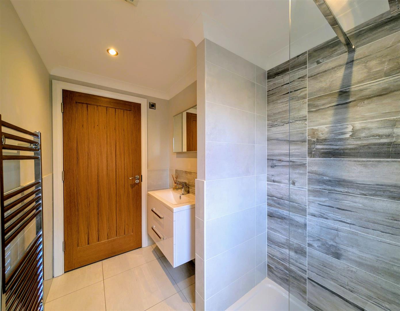 Shower Room - 2.74m x 1.83m max (9' x 6' max) - Double walk in shower enclosure and unit, wash hand basin with a mixer tap and drawers below, low level w.c., chrome heated towel rail, tiled floor, partially tiled walls, coved ceiling, downlighters, extractor fan, upvc double glazed window to rear elevation.